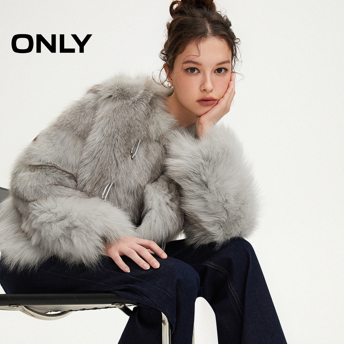皮草外套女 重工盘绳金属扣隐藏侧袋圆领短款 ONLY2025冬季 新款