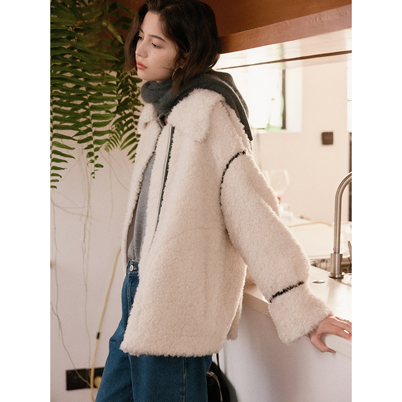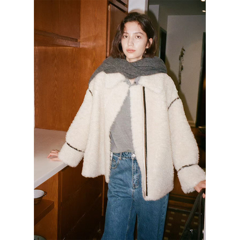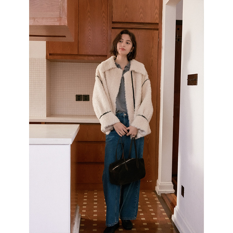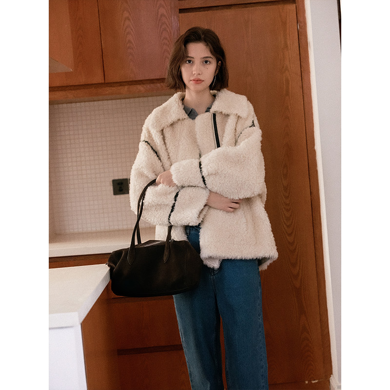 复古黑色明线翻领宽松外套 100%羊毛羊羔毛 Even Vintage