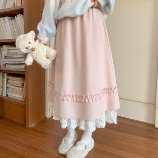 森女部落学院风高腰A字半身裙女2025新款 蕾丝拼接设计感长裙 冬季