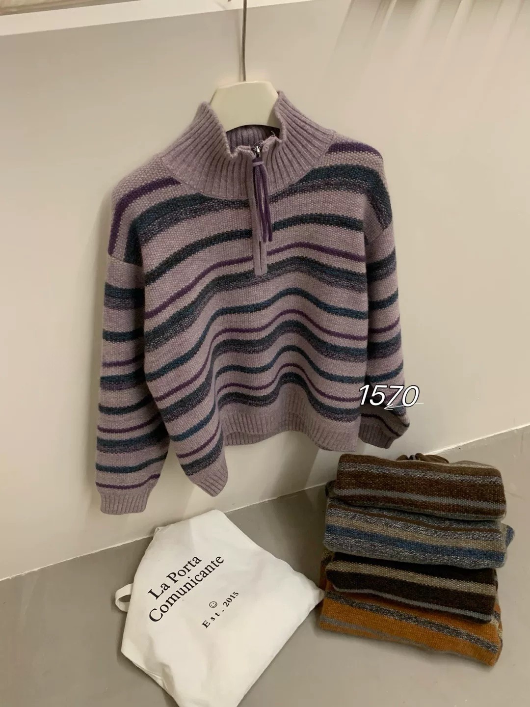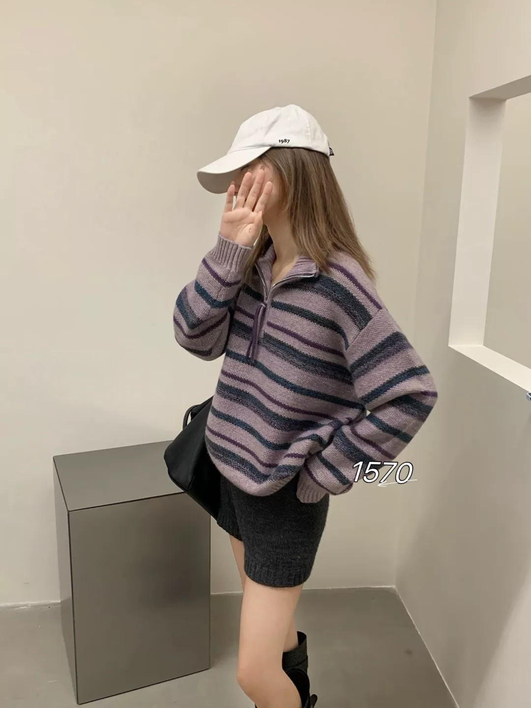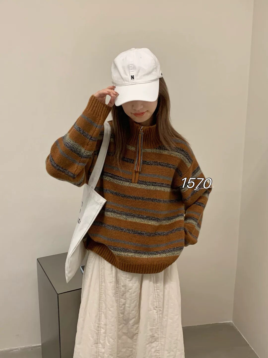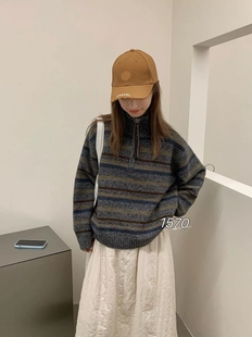拼色花线半拉链百搭休闲条纹毛衣外套上衣 宽松时尚 秋冬新款 女韩版