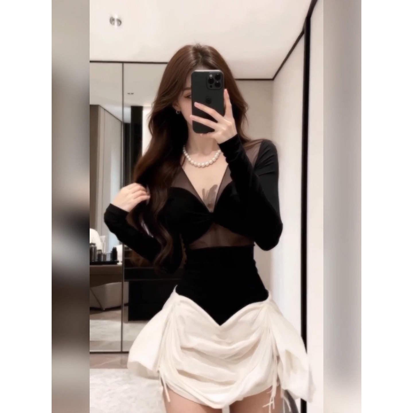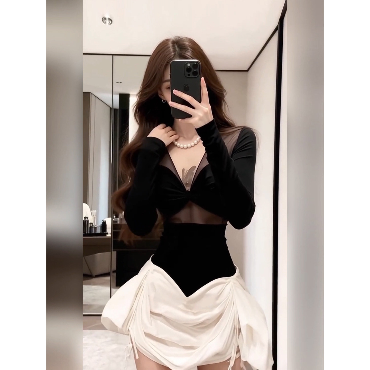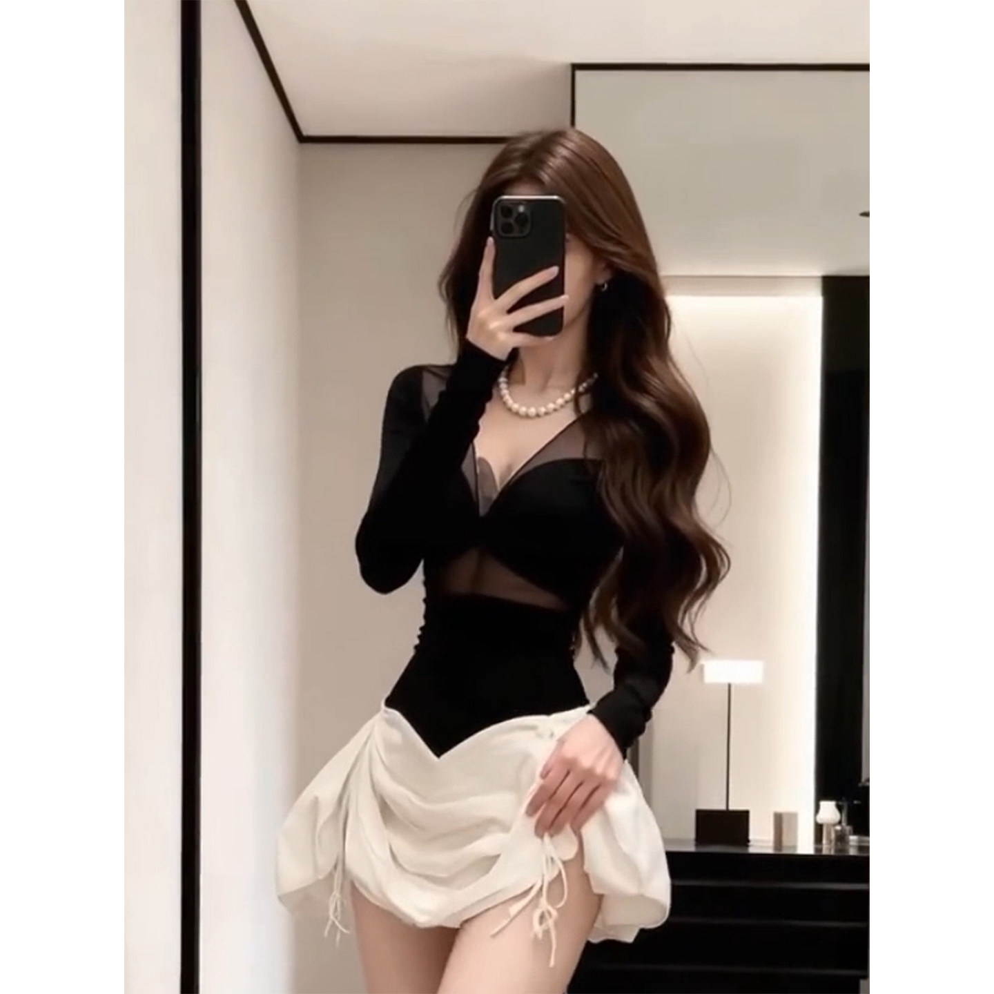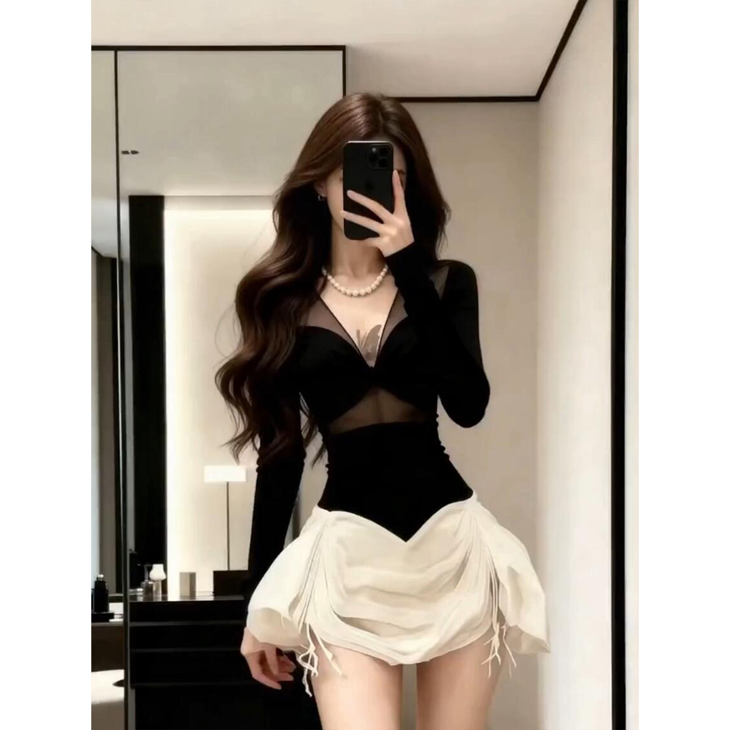 XZY 撞色微透收腰短裙 微胖韩系辣妹V领网纱拼接连衣裙女25年冬季