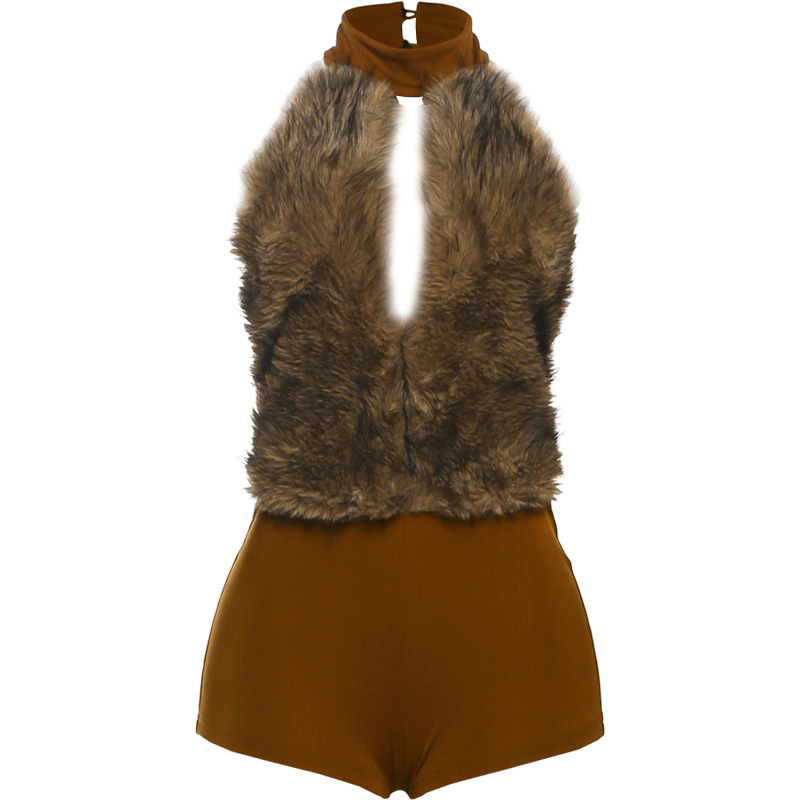 设计感显瘦大露背短裤 时尚 欧美ins毛绒拼接镂空挂脖连体裤 KLIOU
