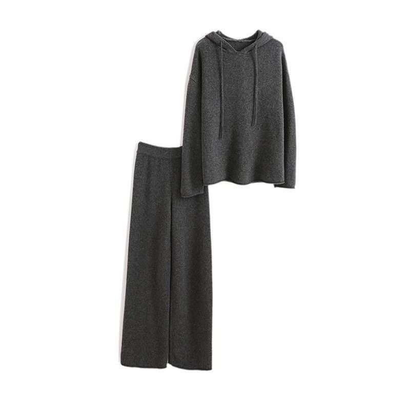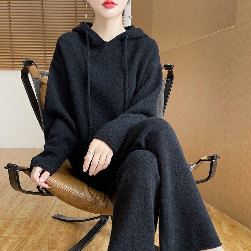 时尚 秋冬新款 针织毛衫 女连帽毛衣宽松阔腿裤 两件套加厚 春秋套装