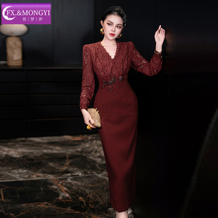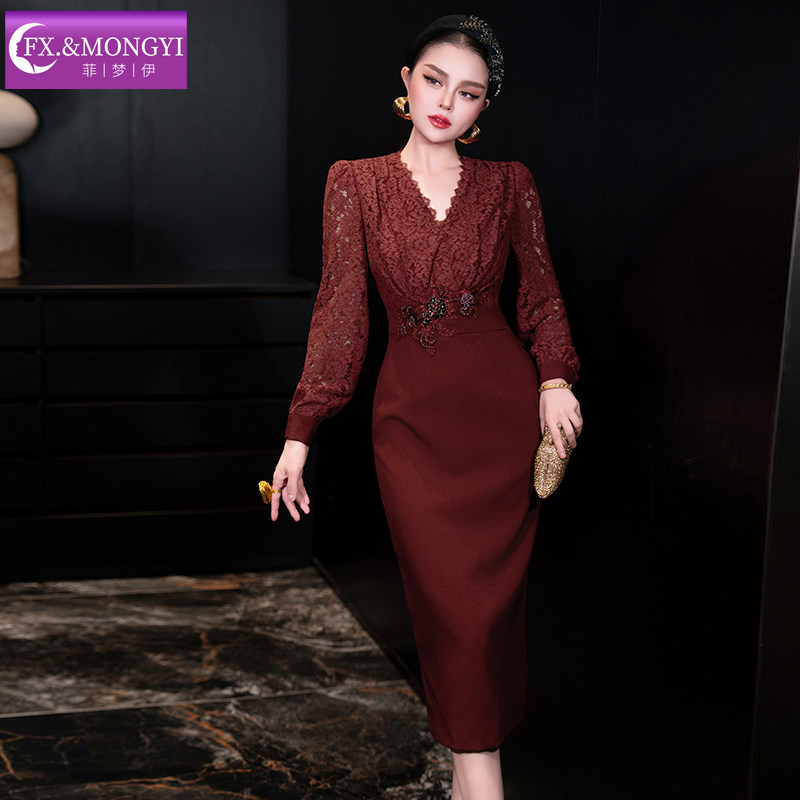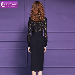 菲梦伊原创钉珠蕾丝黑色连衣裙女长袖 名媛轻熟精致收腰包臀裙 秋装