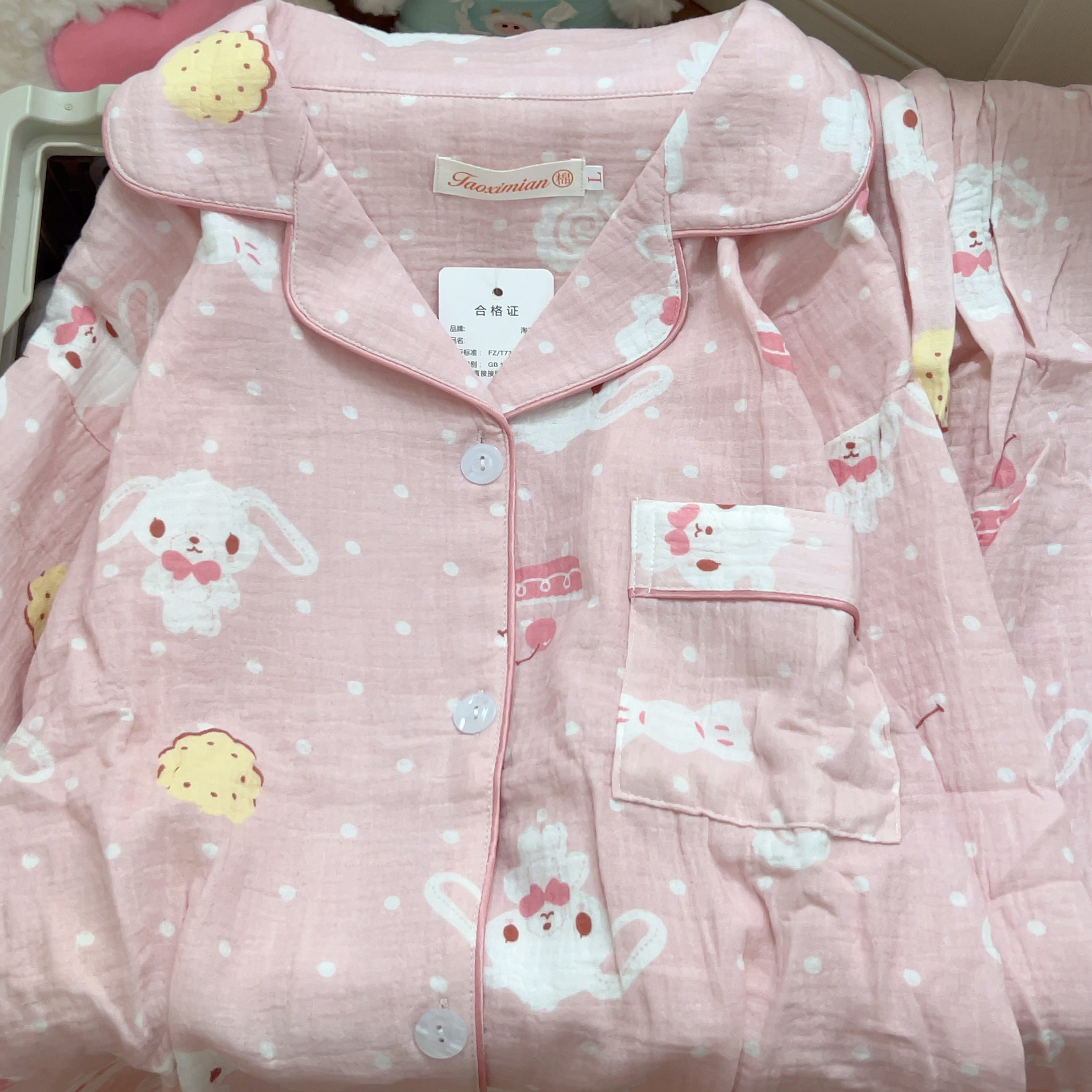 粉色甜点兔秋季 休闲家居服舒适透气 卡通睡衣女纯棉棉纱春秋长袖