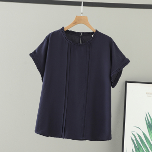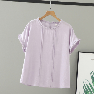 木耳边女上衣盐系大码 宽松短袖 对称压褶圆领T恤 2026女装 胖mm夏装