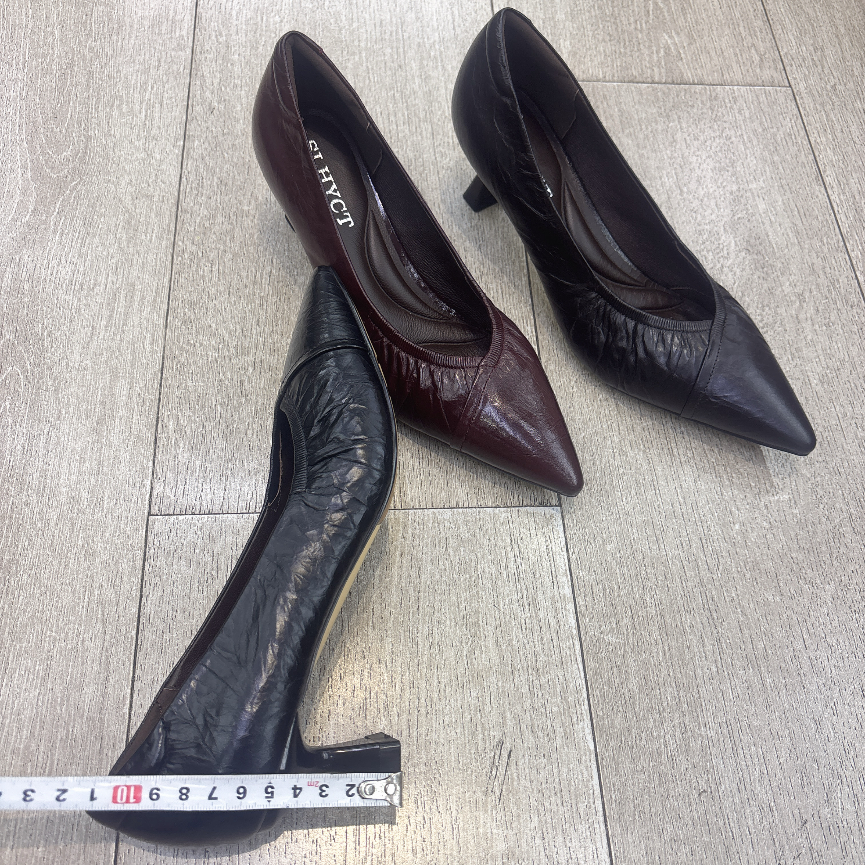 551 诗路花语2025秋款 女鞋 女浅口尖头褶皱时尚 260 真皮细跟高跟鞋