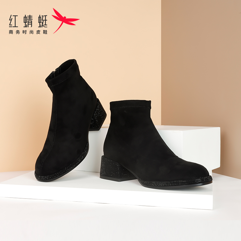 百丽画廊假日加绒时装 弹力靴反绒面粗高跟显瘦瘦短靴子BBWB1DZ5