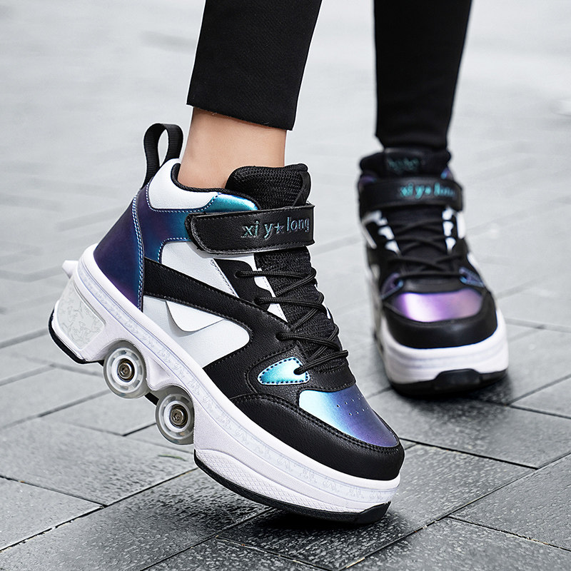 成年人双轮排一键可收缩轮滑鞋 新款 中小学生代步变形鞋 四轮暴走鞋