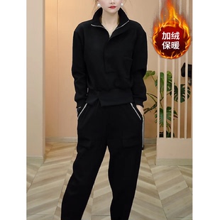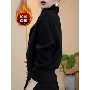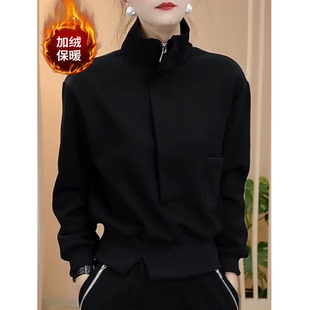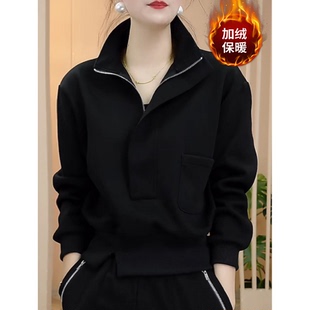 黑色宽松显瘦半拉链短款 新款 上衣 立领套头加绒卫衣女2026秋季 时尚