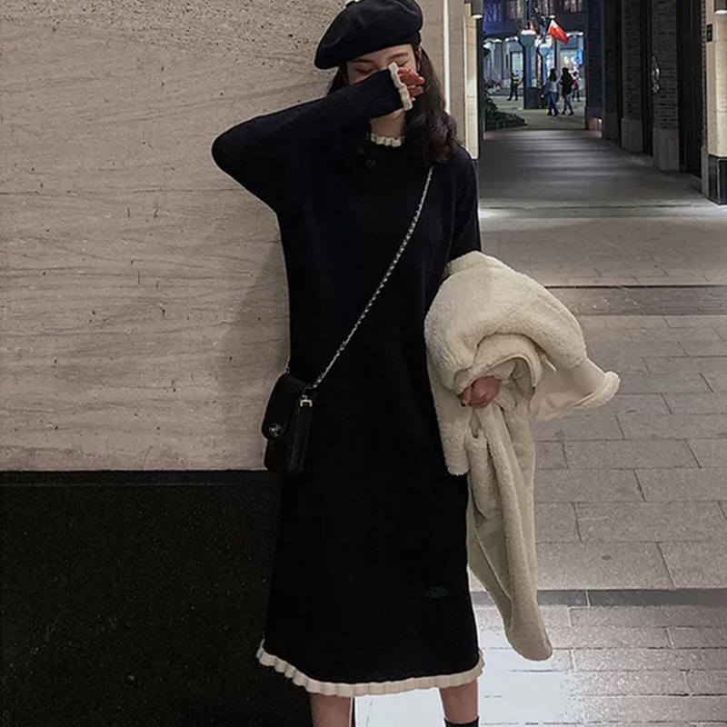 小个子打底内搭长裙 高级感黑色毛衣女针织连衣裙子修身 秋冬季 新款
