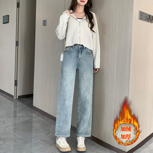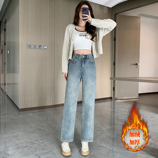 高腰加绒宽松拖地直筒裤 新款 子 女加绒2025年冬季 黑灰色阔腿牛仔裤