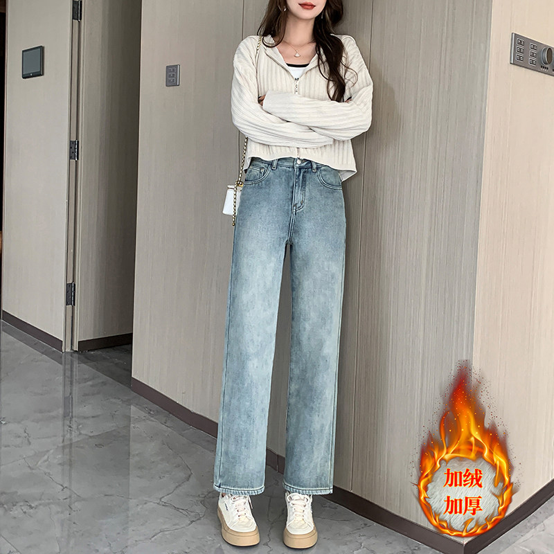 牛仔加绒阔腿裤 宽松休闲裤 牛仔微喇裤 惠衣阁秋冬女高腰加绒牛仔裤