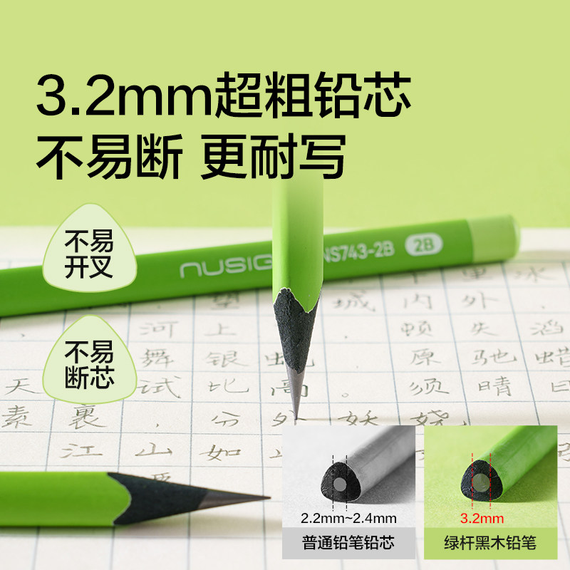 Nusign纽赛小绿杆黑木铅笔hb小学生专用一二年级学习用品正姿高颜值加粗铅芯无铅毒得力书写绘画矫姿素描初学
