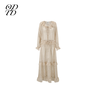 新款 ODTD25秋季 波西米亚风拼接小众印花系带连衣裙 设计师女装