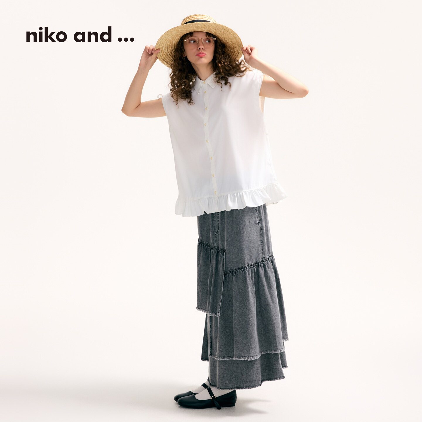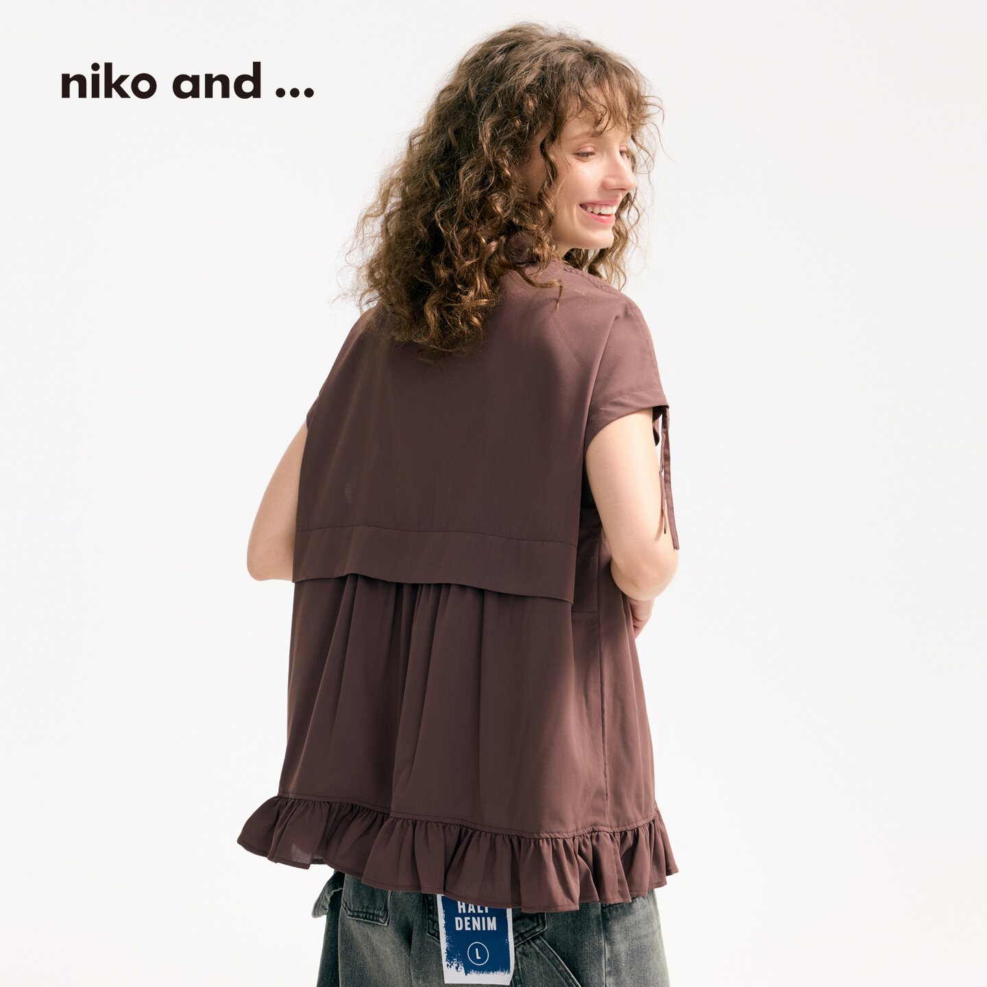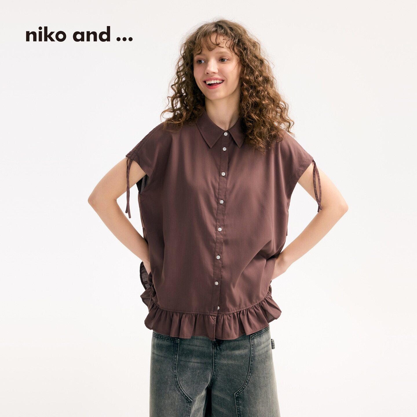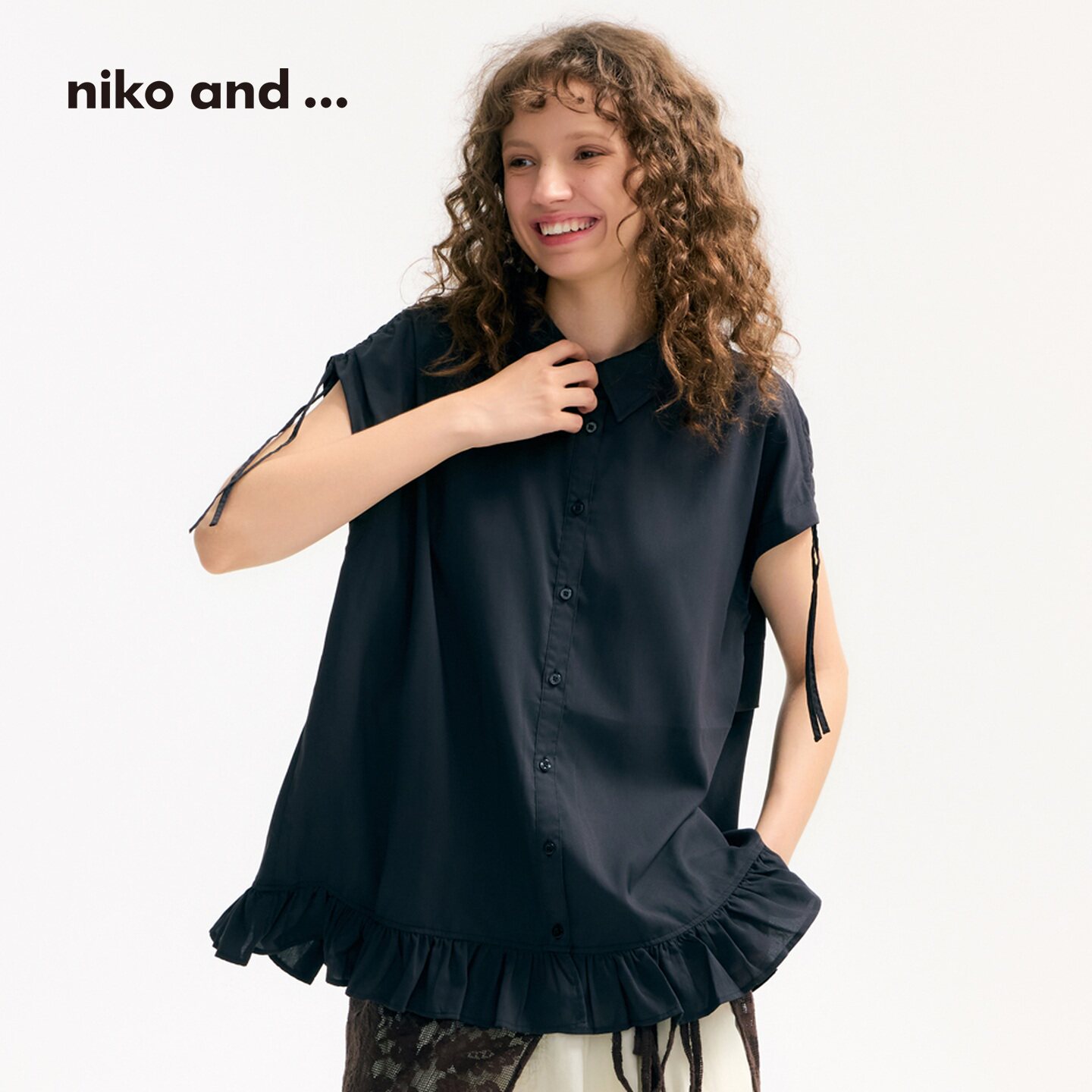 女2025夏季 ...衬衫 新款 纯色短袖 上衣570606 niko 荷叶下摆短袖 and