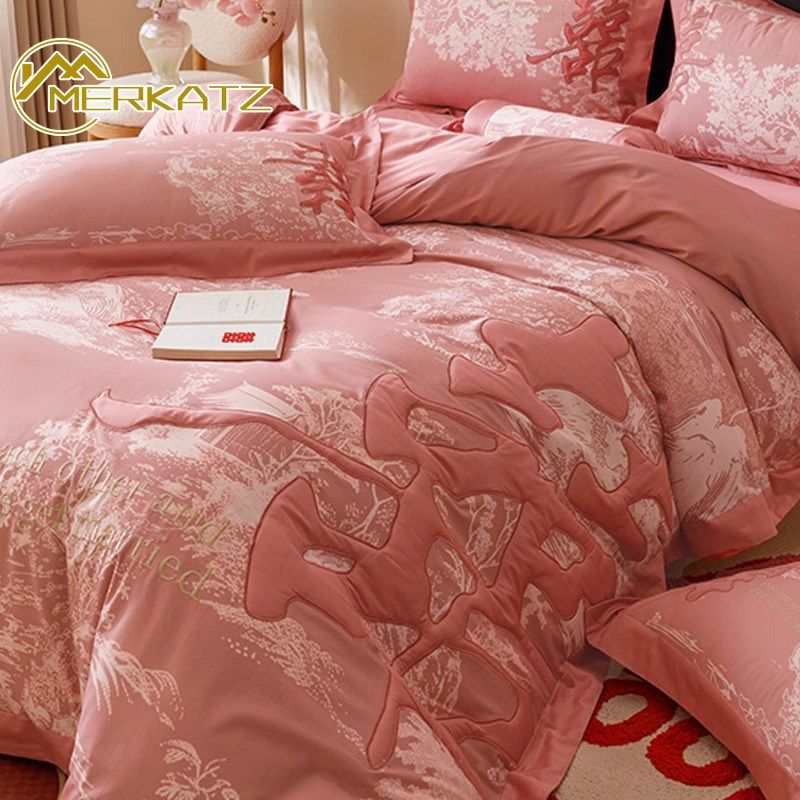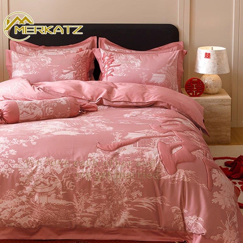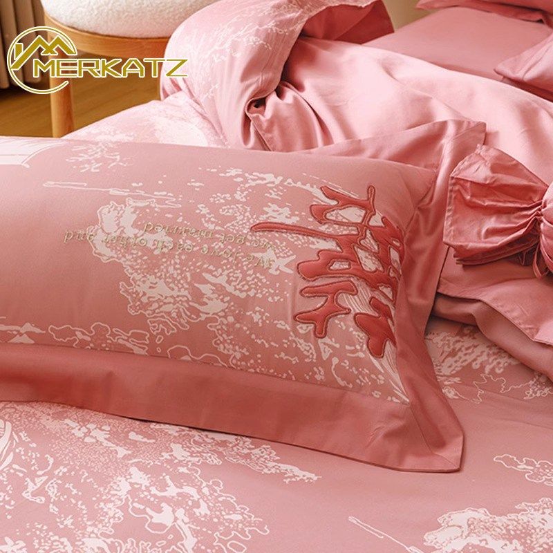 轻奢四件套100S全棉结婚床上用品粉色喜字刺绣被套床单长绒棉喜被