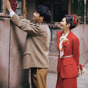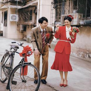 新红色复古港风爸妈80年代结婚怀旧礼服主题婚纱影楼情侣拍照服装