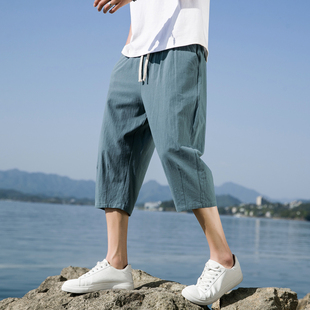 束脚锥形哈伦萝卜裤 日系复古裤 潮牌痞帅大码 亚棉麻八分裤 子男薄款
