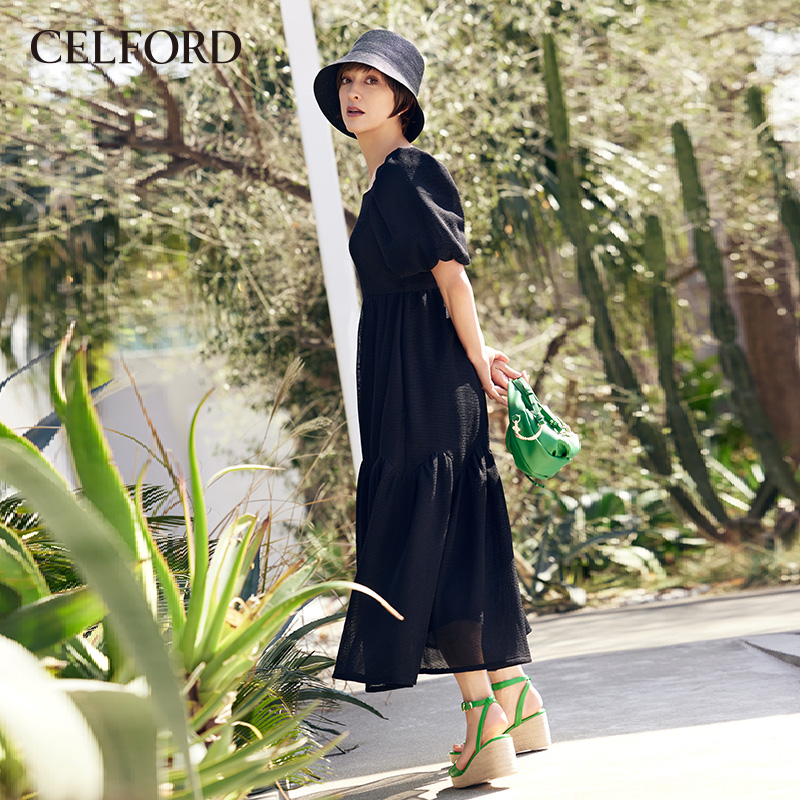 CELFORD春夏新品 抽褶方领连衣裙CWFO232050 甜美优雅泡泡袖