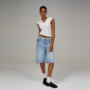 小飞袖 PUKI 辣妹V领设计显瘦美式 背心 坎肩上衣 假两件荷叶边修身