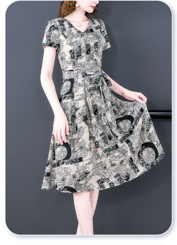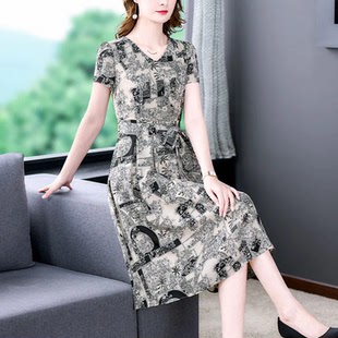 女士短袖 系带宽松收腰显瘦中长款 印花裙子 新款 冰丝连衣裙2025夏季