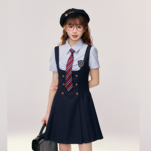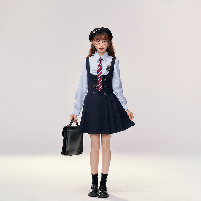 衬衫 织物猪 女校园长袖 蓝色英伦学院风套装 jk制服背心裙 江原女高