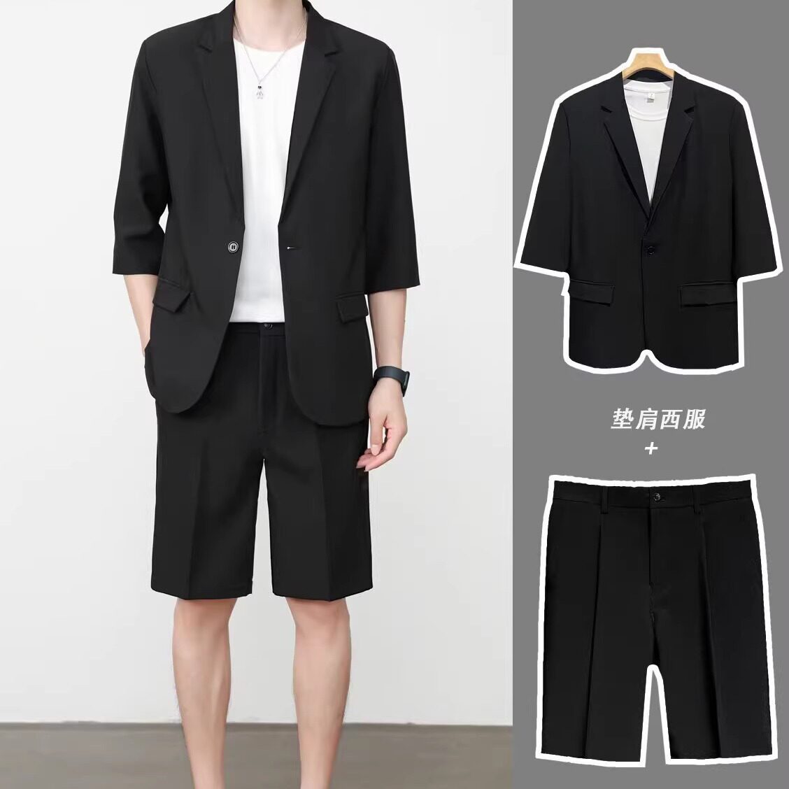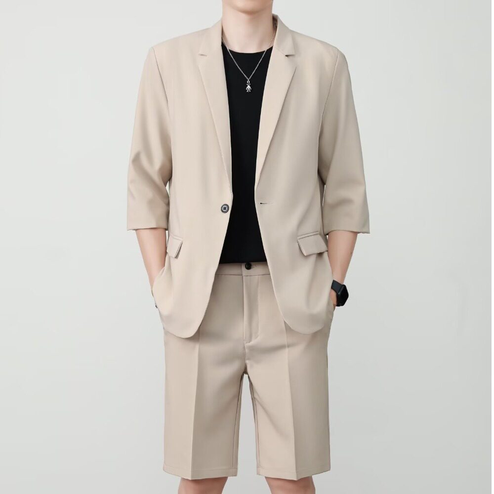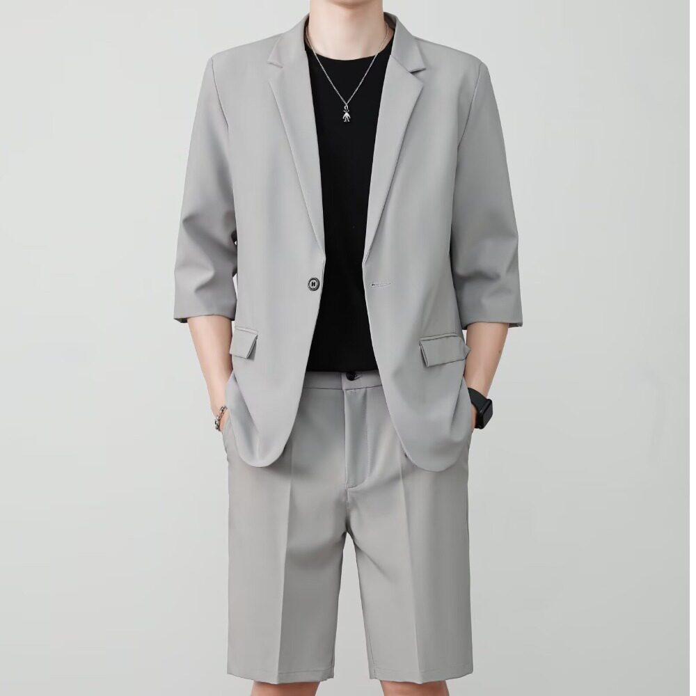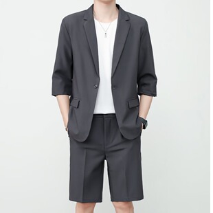 西装 冰丝短袖 套装 男高级感休闲七分半袖 垂感 夏季 西服外套韩版 薄款