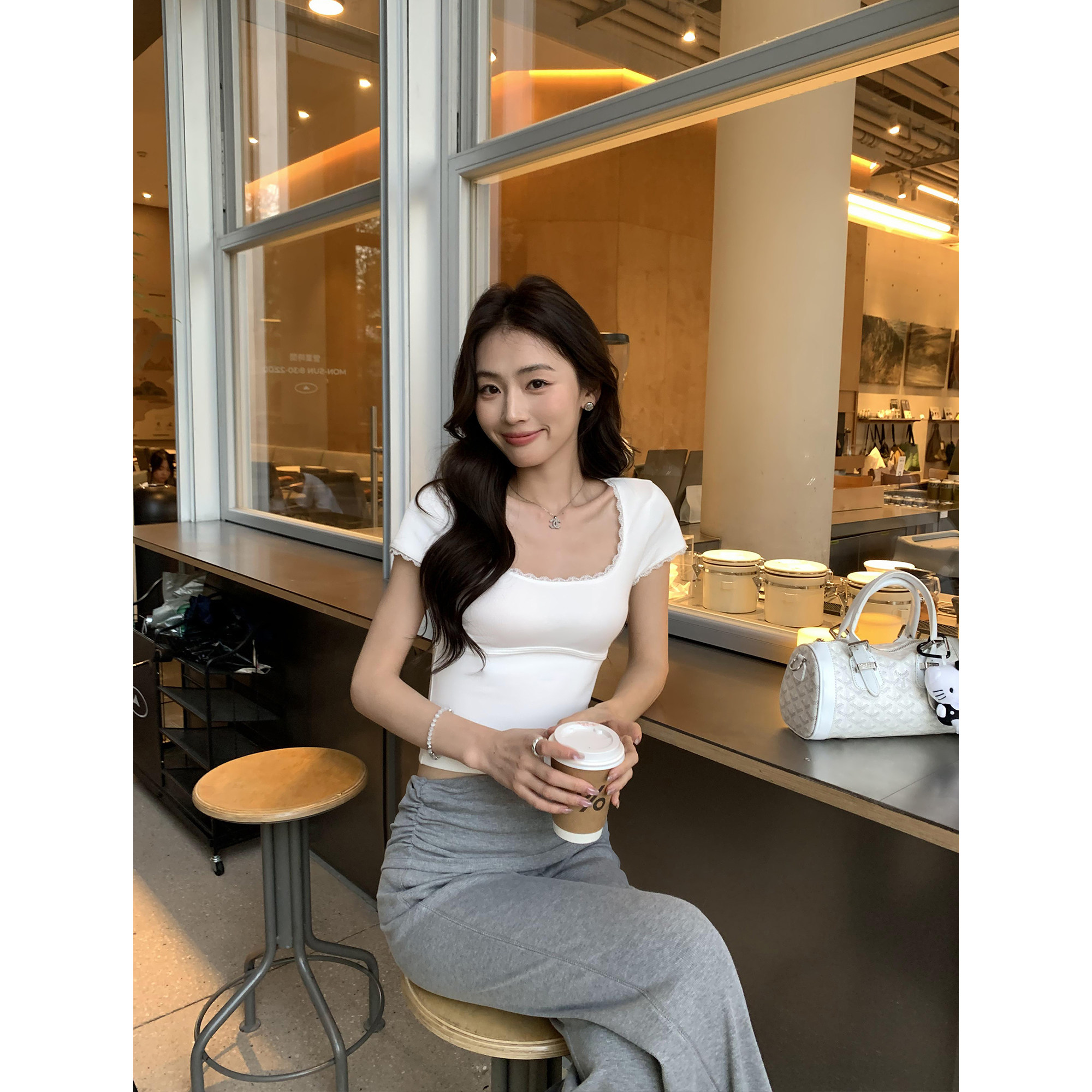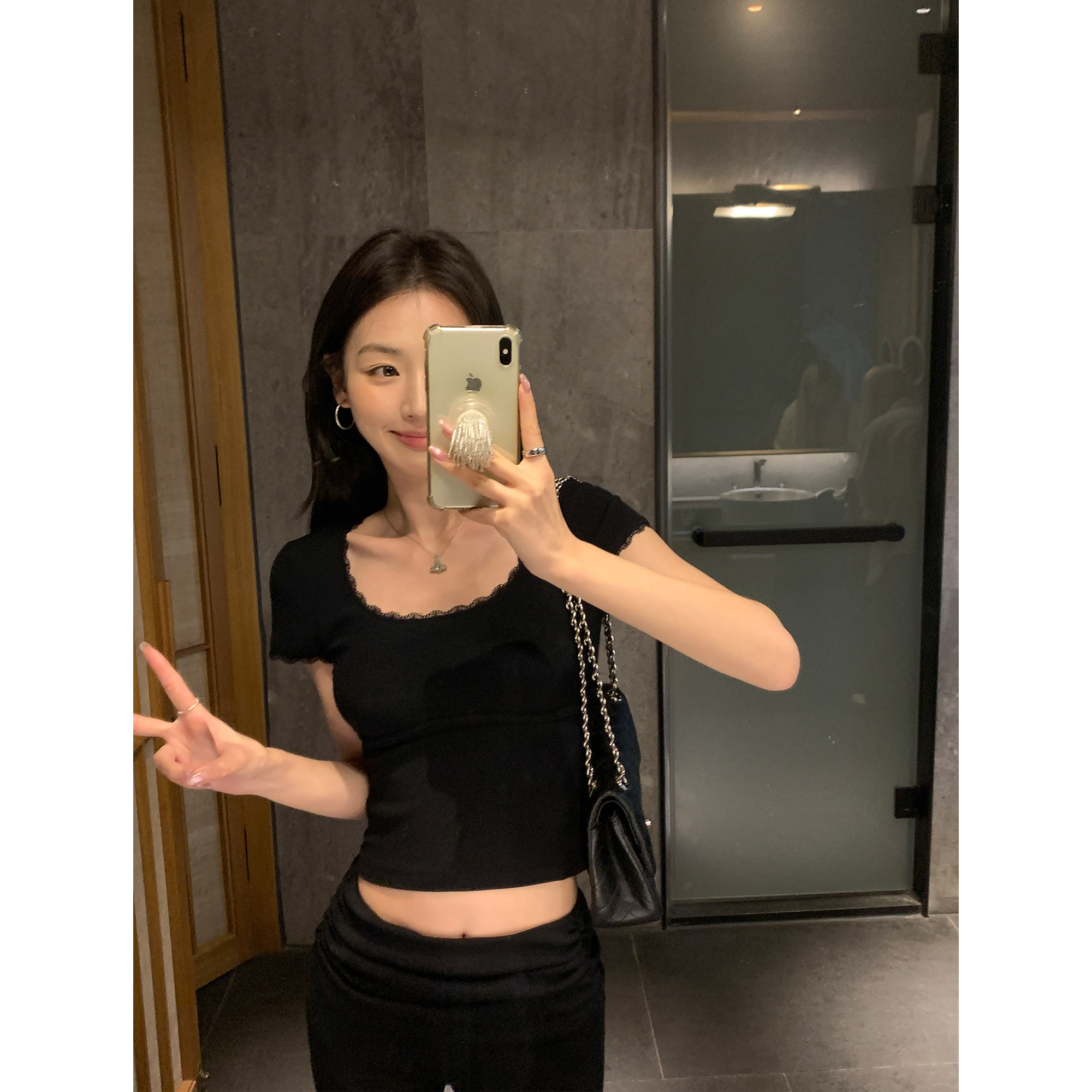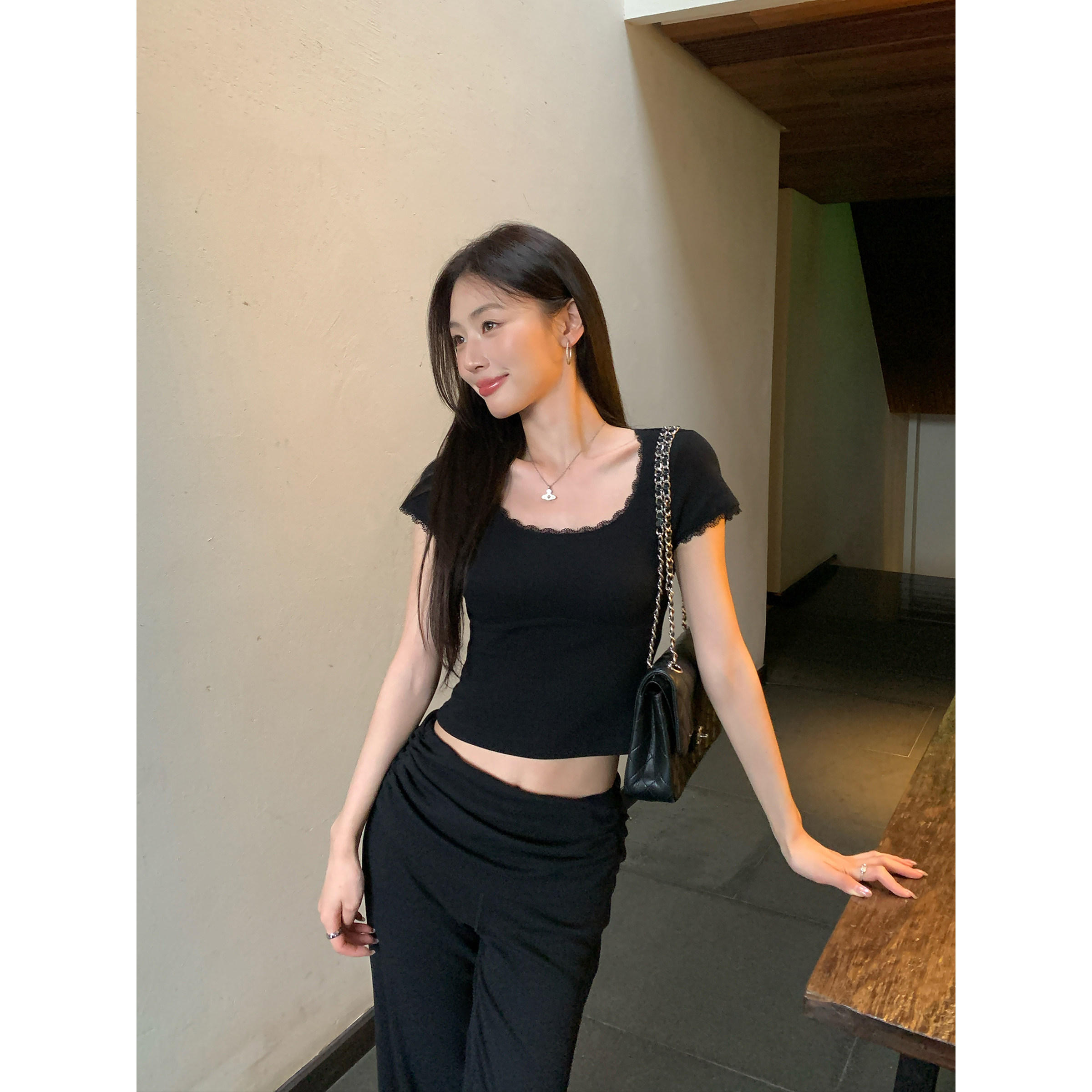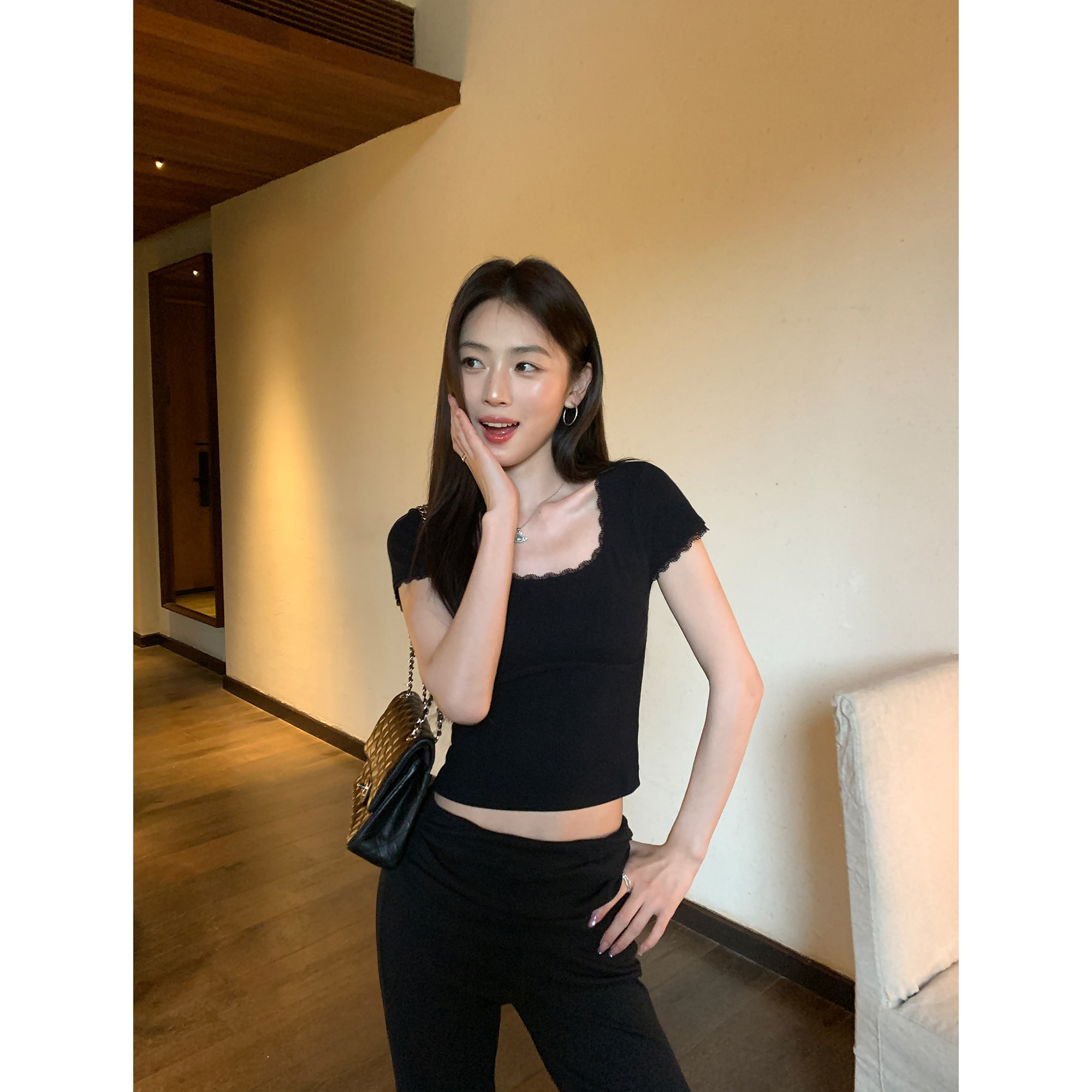 气质短款 pusumede t恤女修身 蕾丝花边u领短袖 针织上衣 纯欲大领T