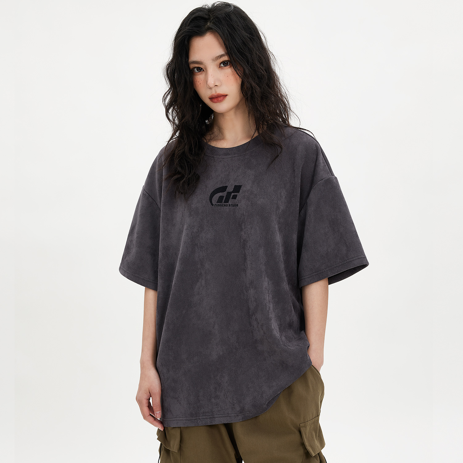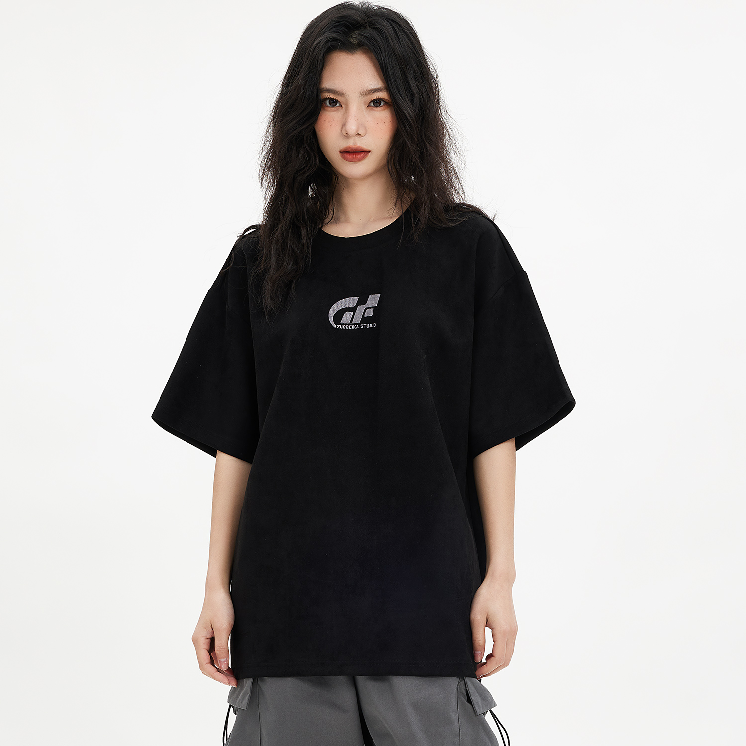 280G重磅 设计感半袖 麂皮短袖 复古刺绣宽松情侣装 T恤女夏美式