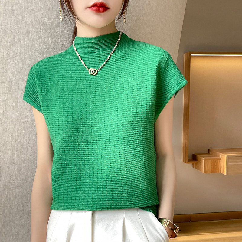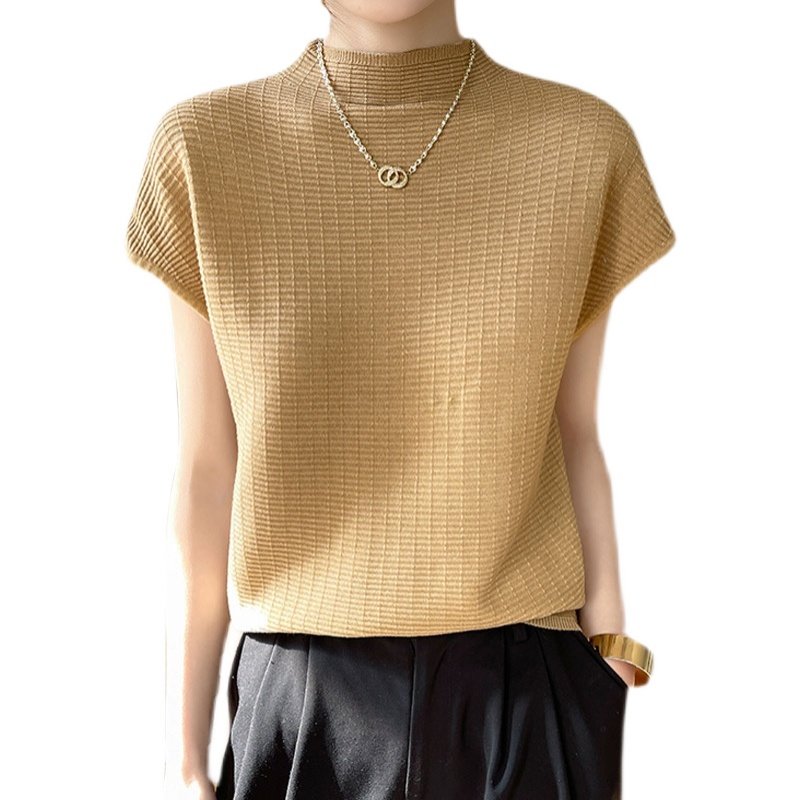 上衣 T恤女宽松套头纯色羊绒打底半袖 2023新款 半高领羊毛针织短袖