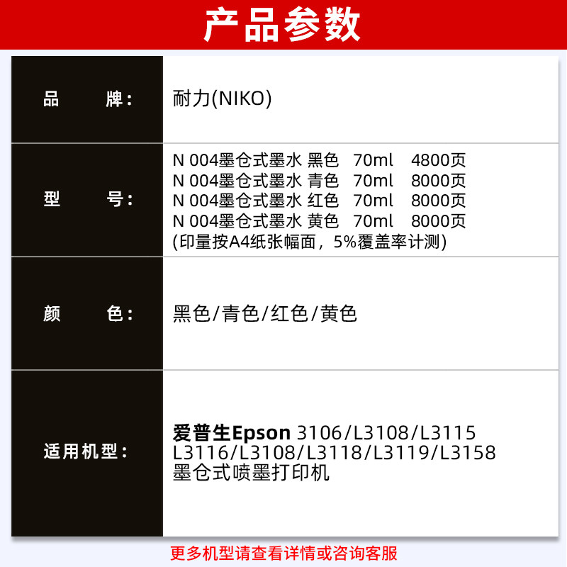 L3256 喷墨打印 L3115 墨水适用L3251 L3253 3116 L326X L3258 3119 爱普生Epson004原装 L1119 3118 L3108
