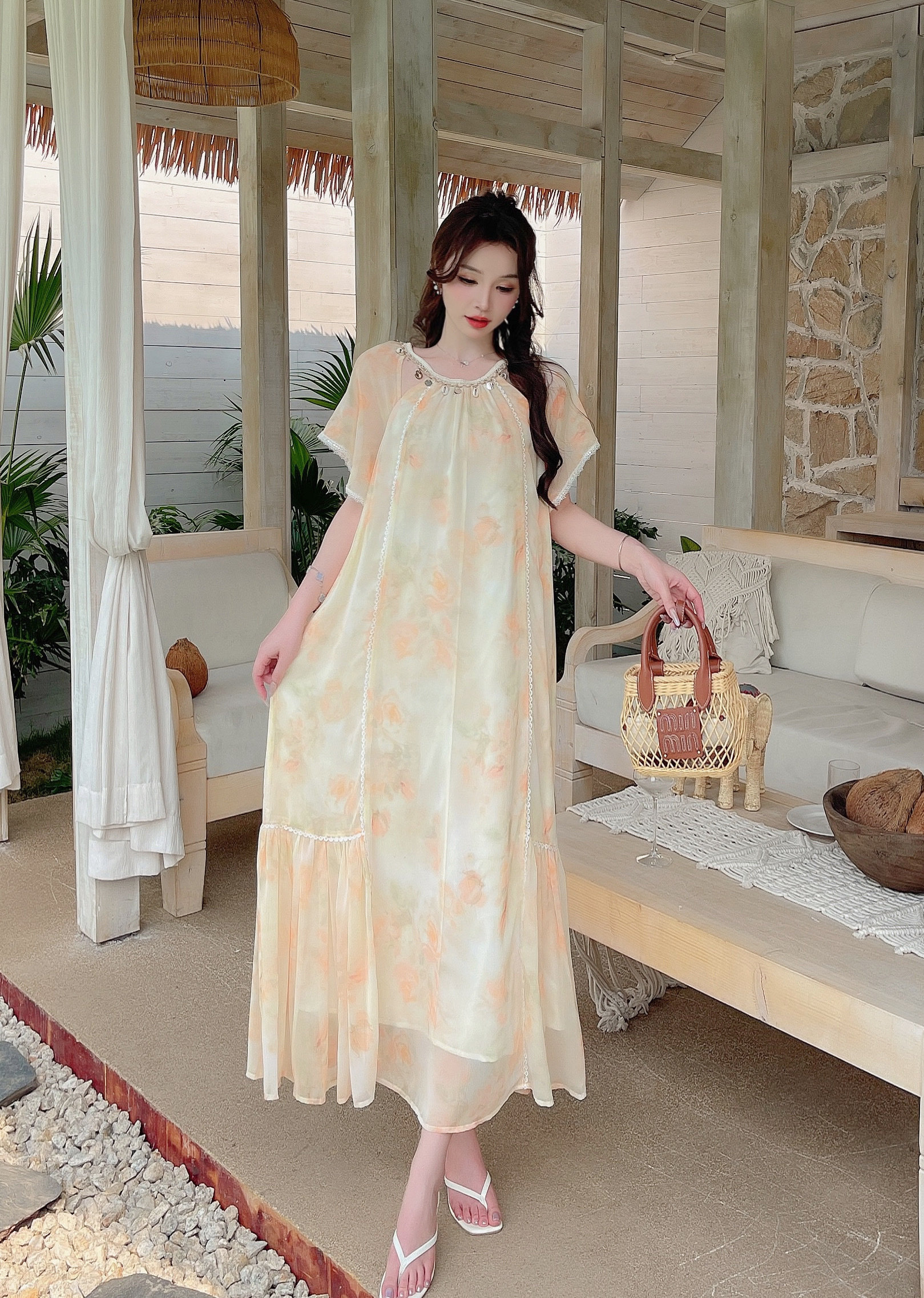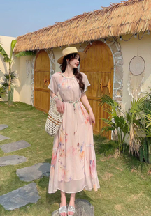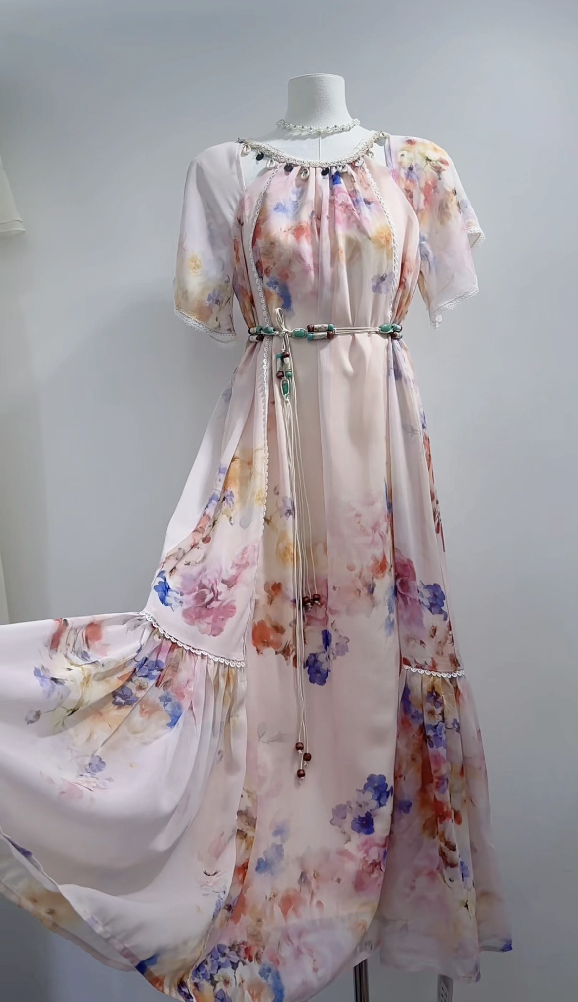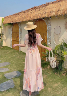 波西米亚系带收腰独特印花连衣裙女2025夏季 海边度假仙女长裙 新款