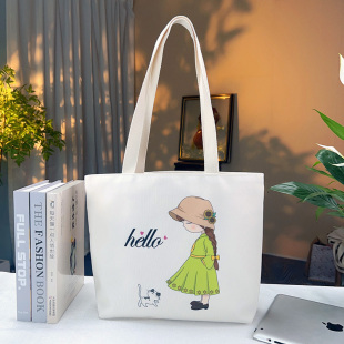 辫子女孩帆布印花单肩手提包大容量卡通学生补习上班通勤时尚 百搭