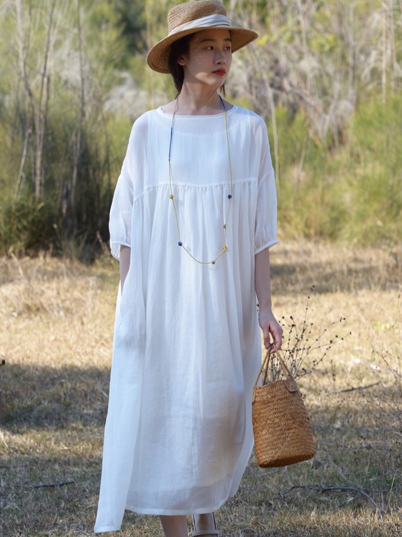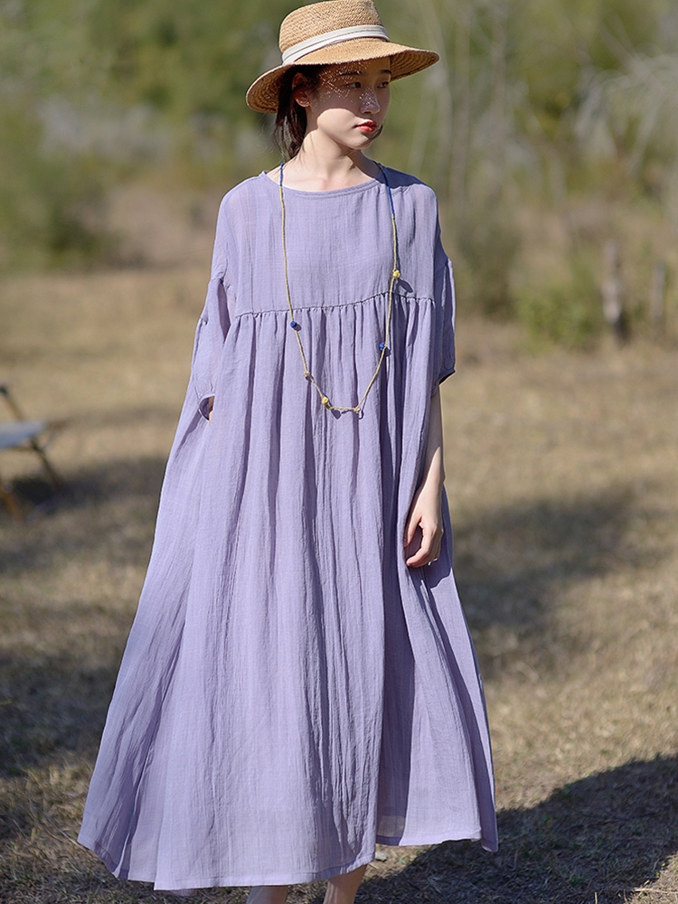 宽松紫色仙女裙纯色 温柔风长款 双层天丝苎麻连衣裙女春季 折扣新款