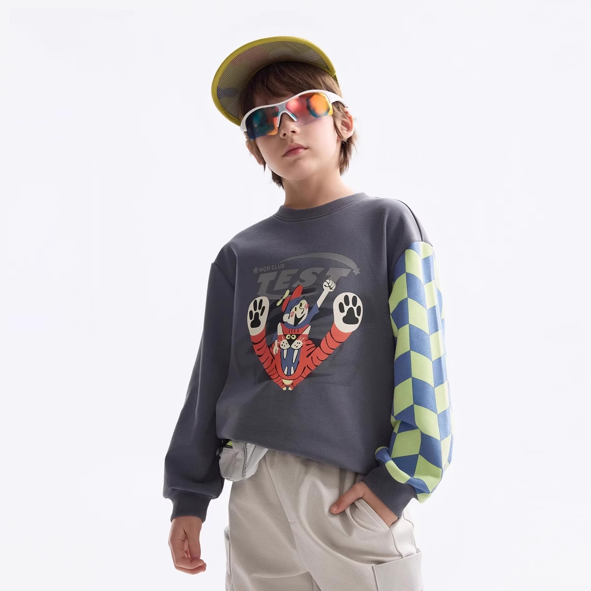 中大童圆领印花棋盘格男童百搭上衣 新款 MQD童装 男童卫衣2025春季