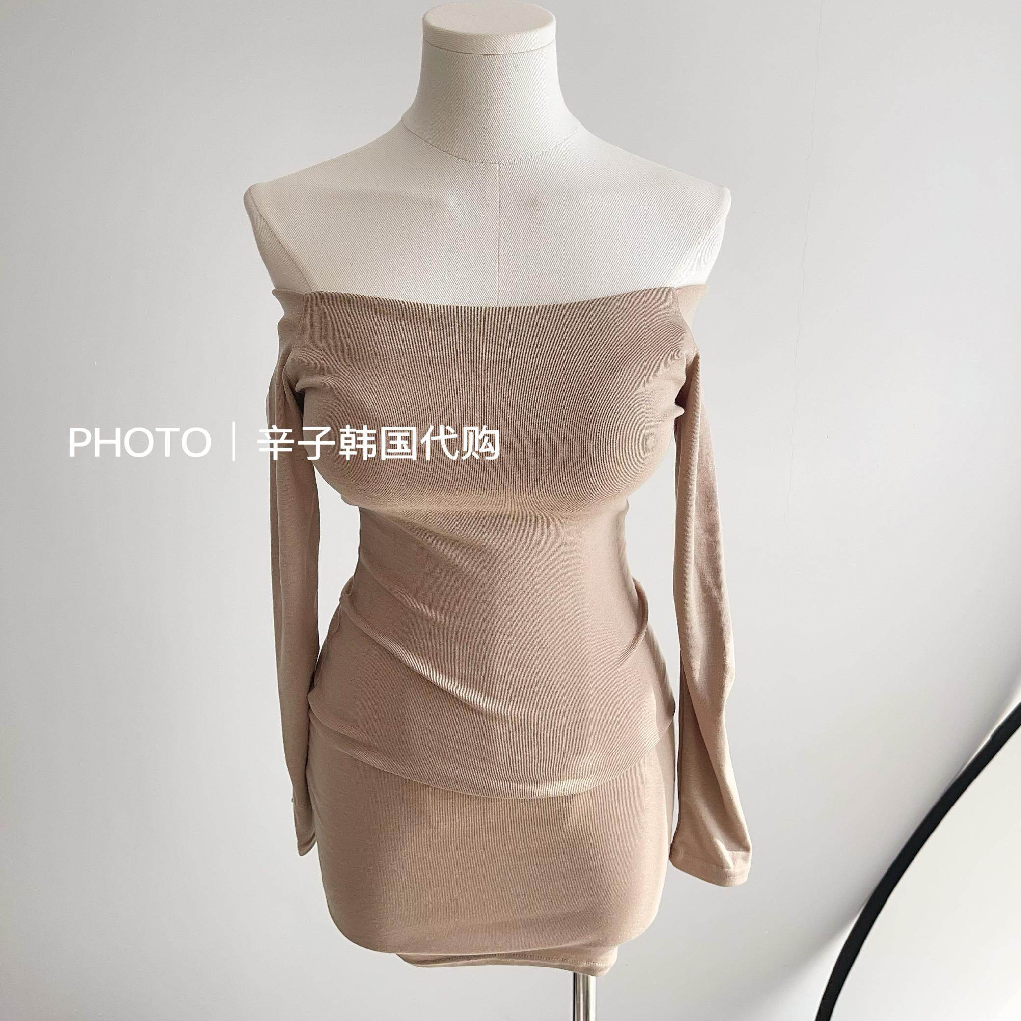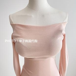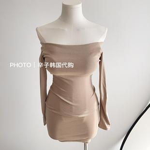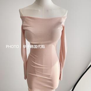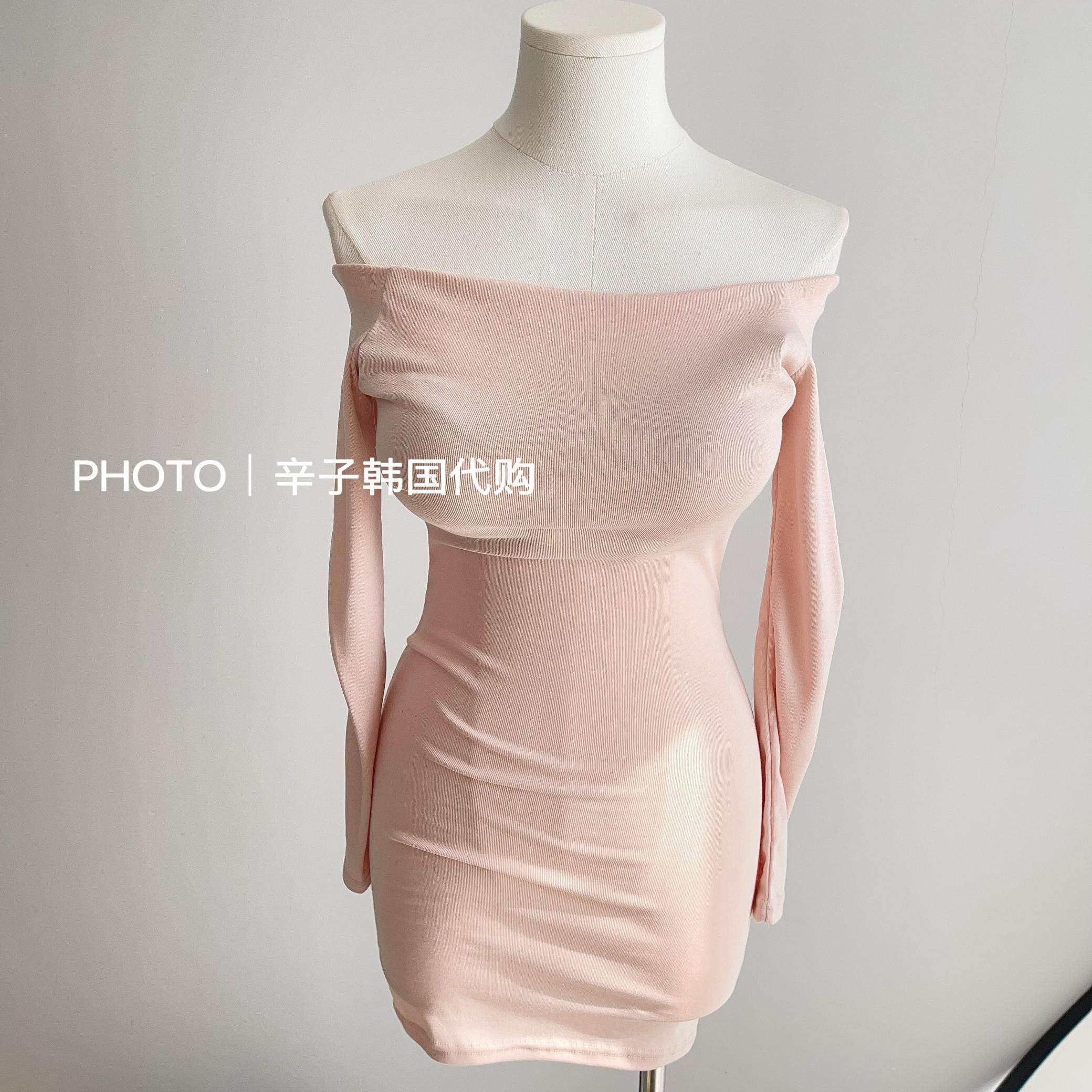 现货秒发 东大门一字领粉色温柔迷人中长开叉连衣裙 辛子韩国代购