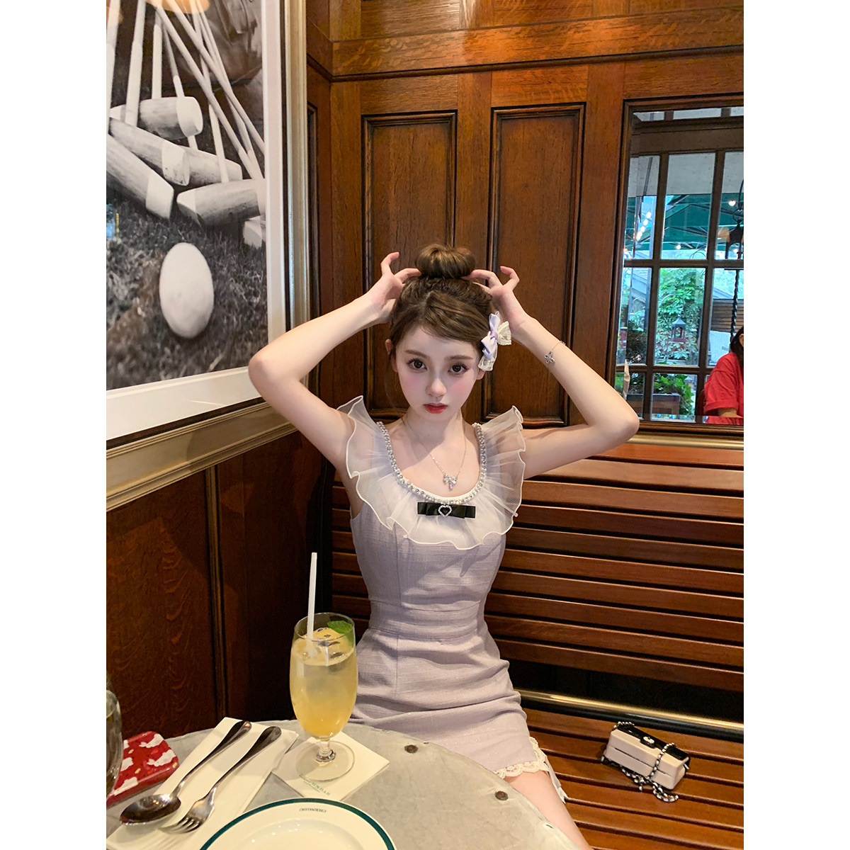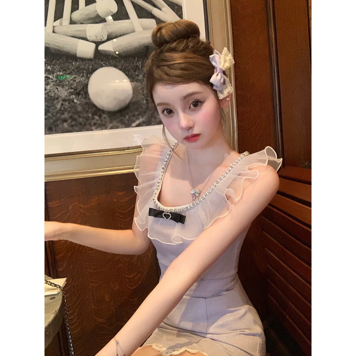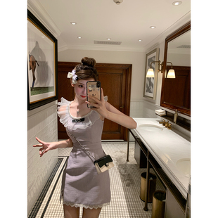 新款 你 蕾丝花边蝴蝶结收腰连衣裙女夏季 海盐葡萄 裙子 懒懒llan