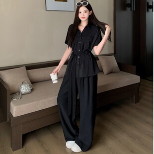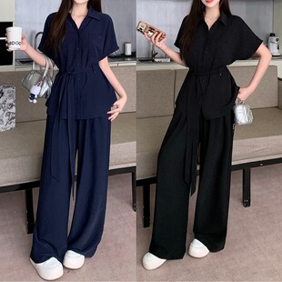 新款 套装 胖mm大码 上衣阔腿裤 女优雅气质绑带收腰衬衫 韩婷l夏装