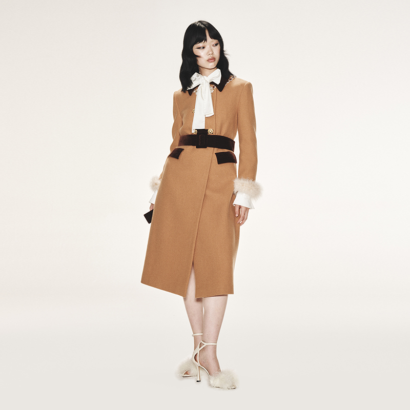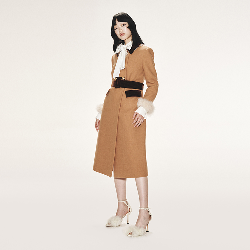 lefame拉飞姆骑士风珠宝蝴蝶结羽毛长外套