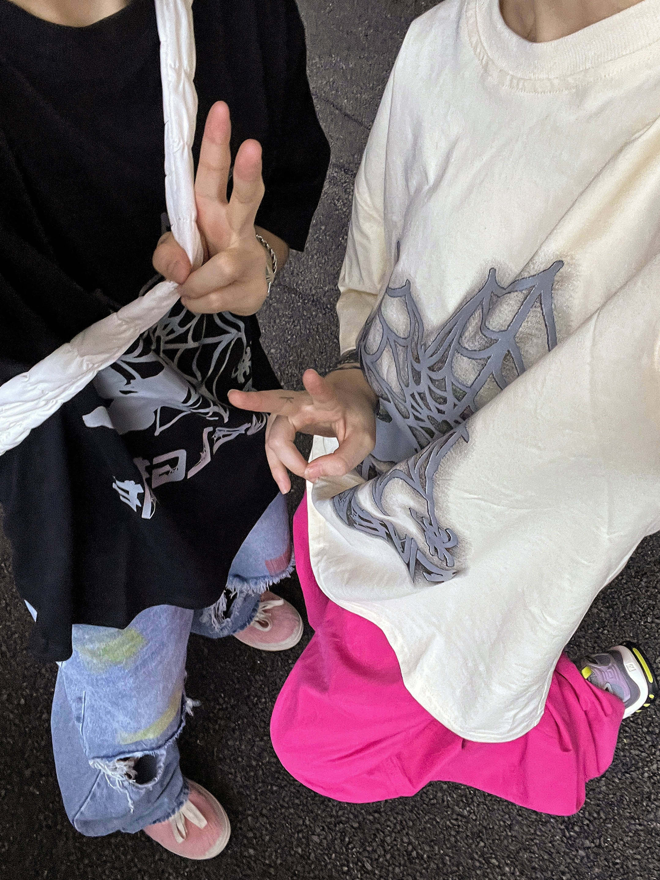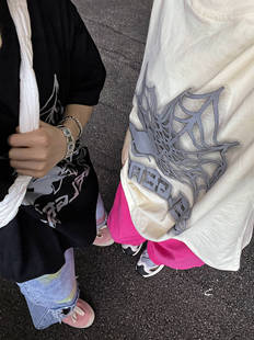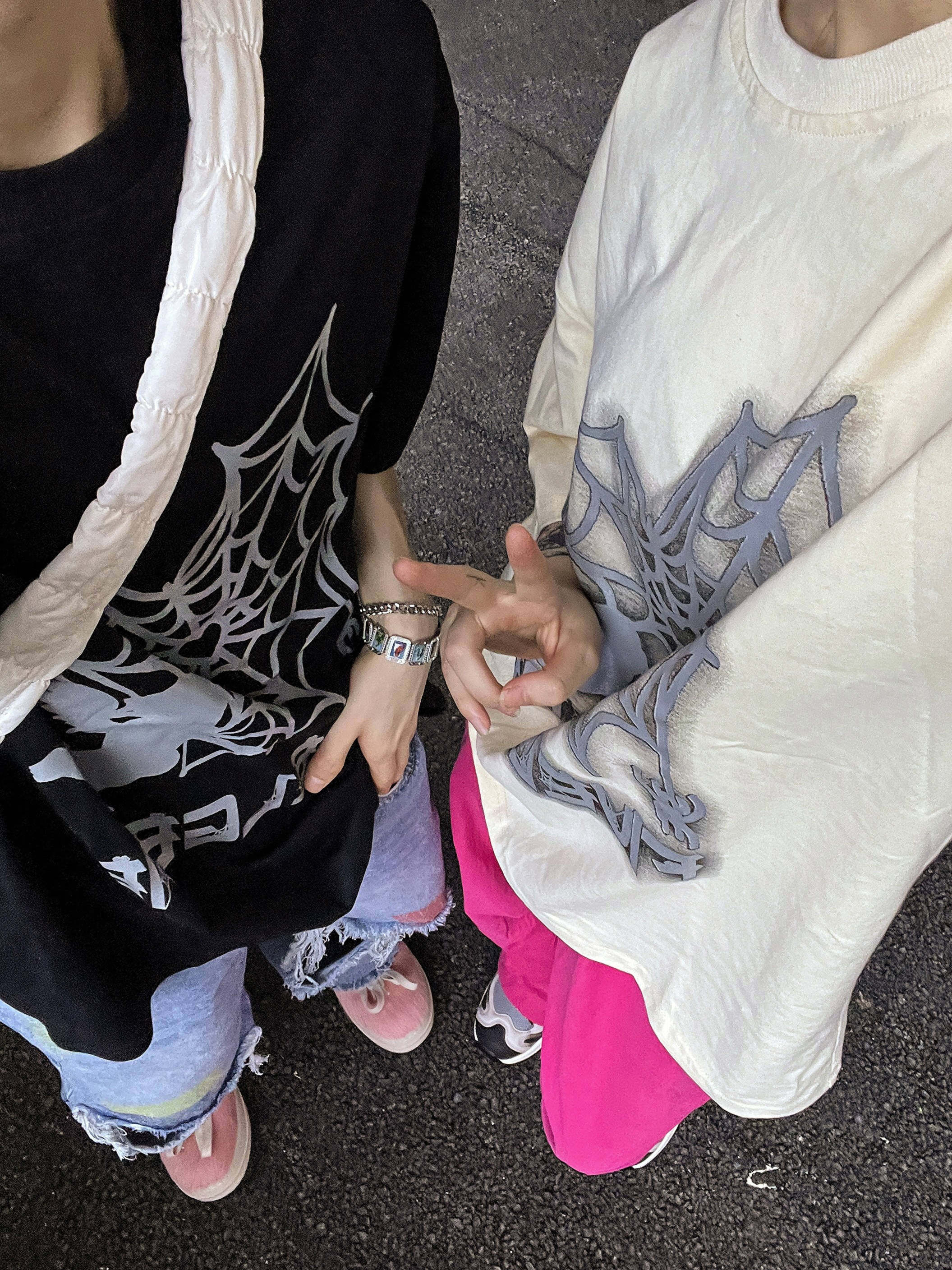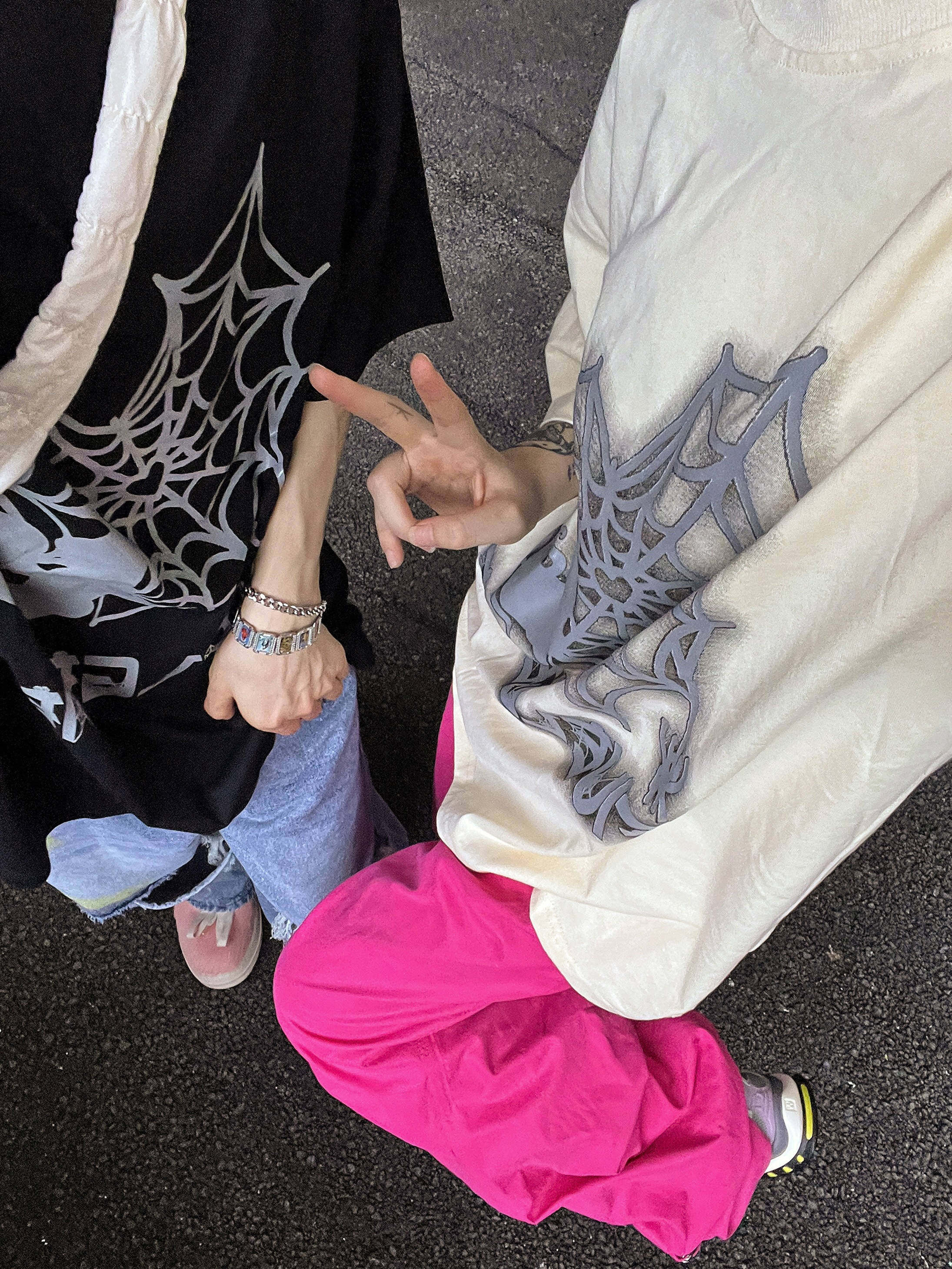 情侣夏季 复古蜘蛛网字母印花短袖 宽松T恤 2023AW国潮原创美式 F383