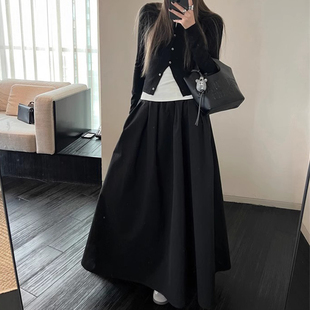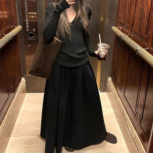 秋冬韩版 中长半身裙格雷灰百褶裙人纹高腰显瘦niu系复古a字裙 西装