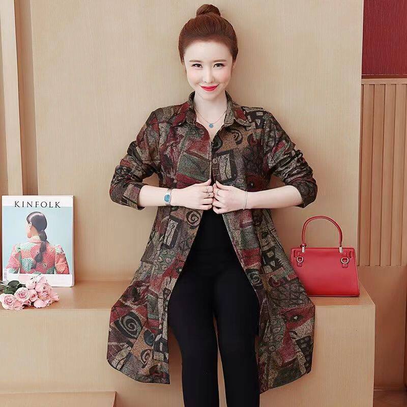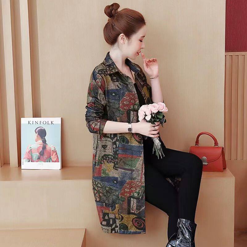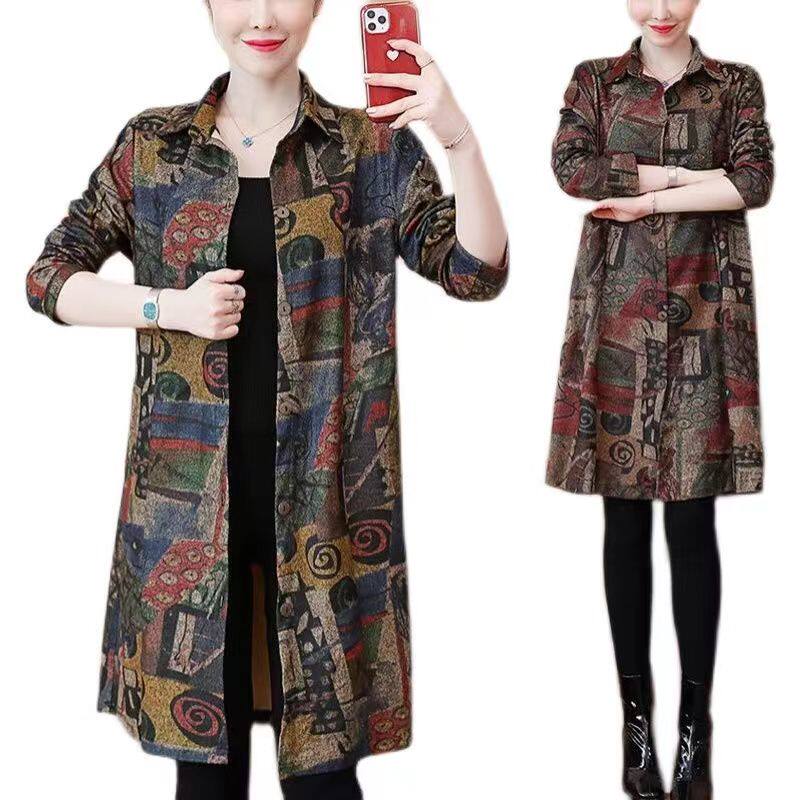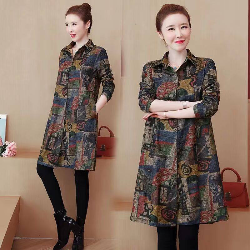 女装 翻领外套200斤印花开衫 新款 衬衫 胖mm秋冬加厚加绒中长款 大码