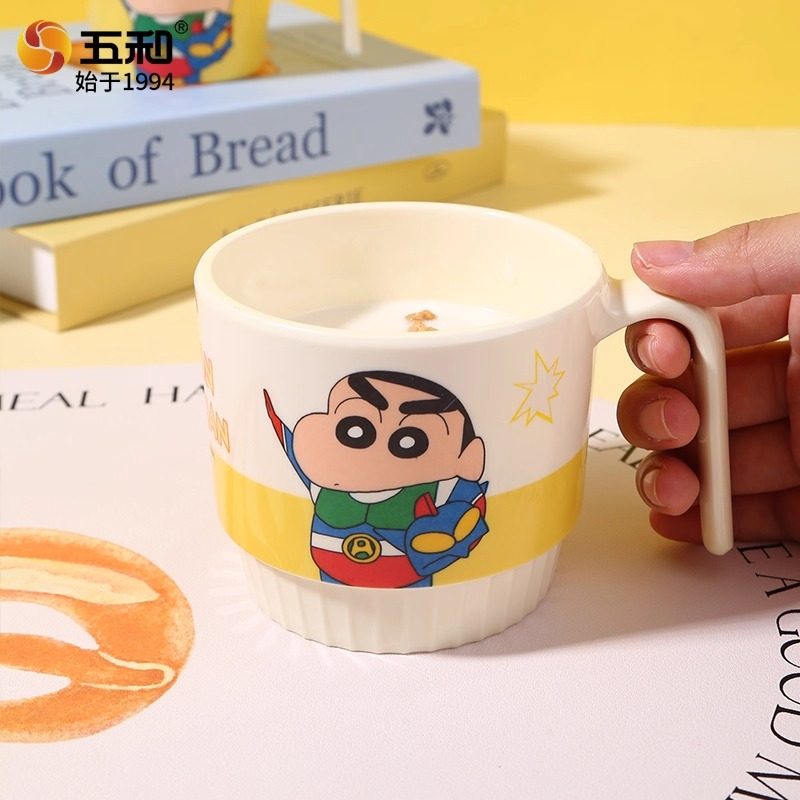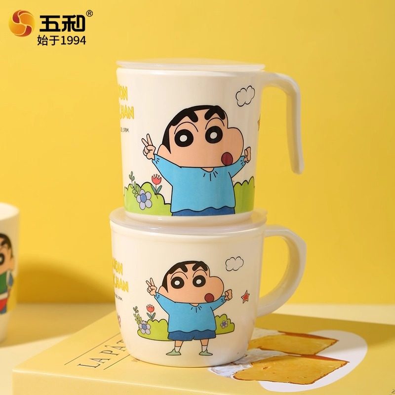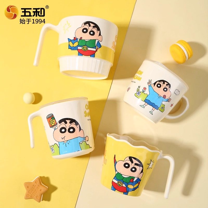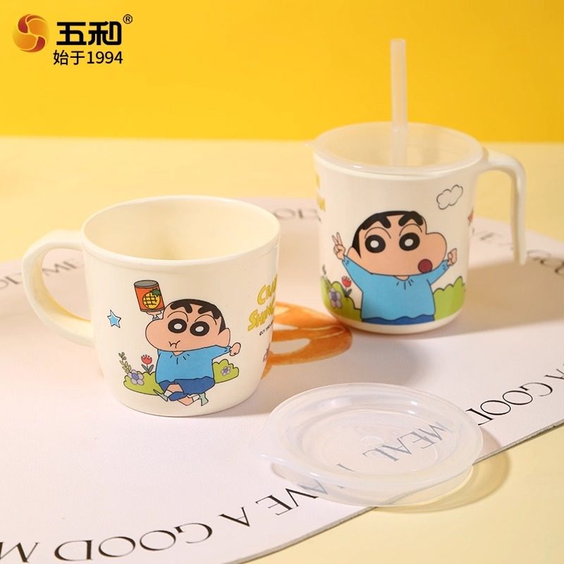 五和蜡笔小新儿童水杯宝宝喝水杯可爱卡通家用喝水杯带盖带勺杯子