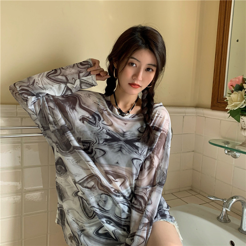 t恤大版 长袖 内搭防晒韩风chic上衣 女ins潮扎染2021新款 网纱打底衫