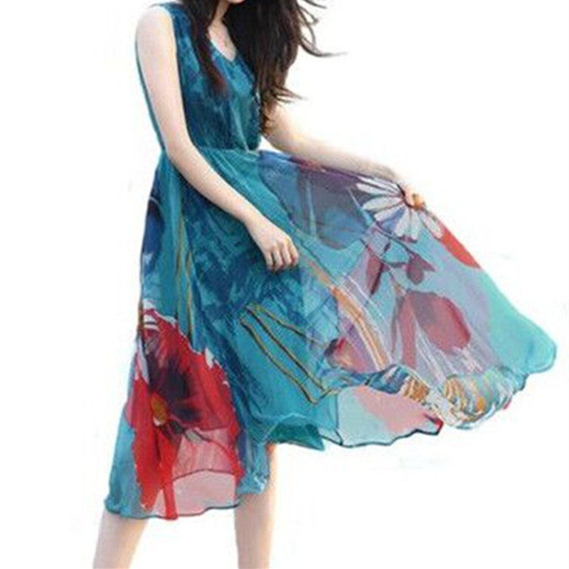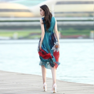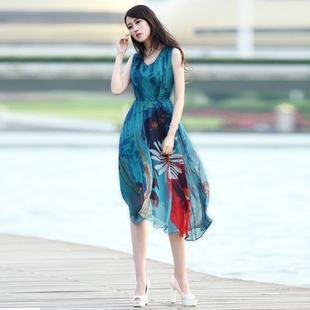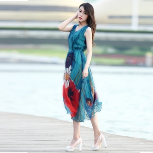 印花连衣裙女中长款 2025新款 波西米亚长裙沙滩裙雪纺背心裙夏季