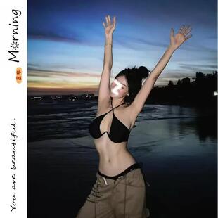 泳衣女新款 黑色性感比基尼分体钢托小胸聚拢挂脖镂空度假温泉泳装