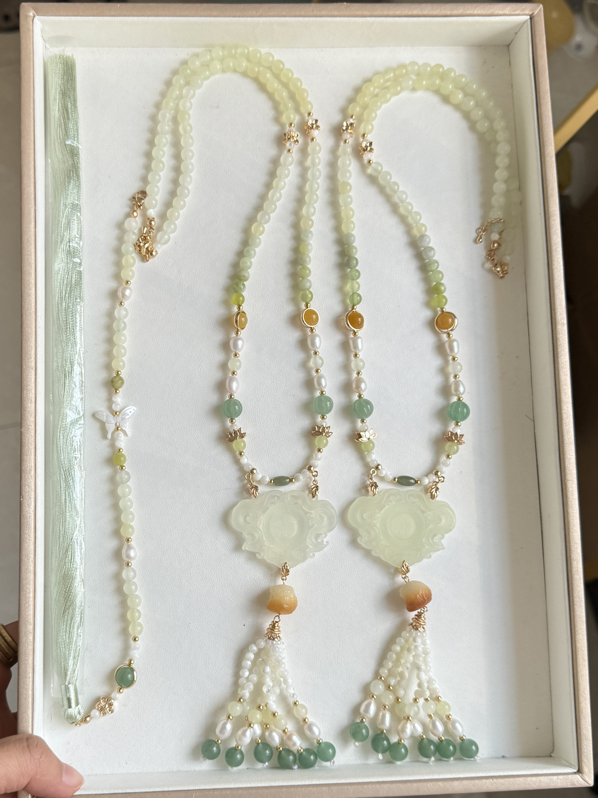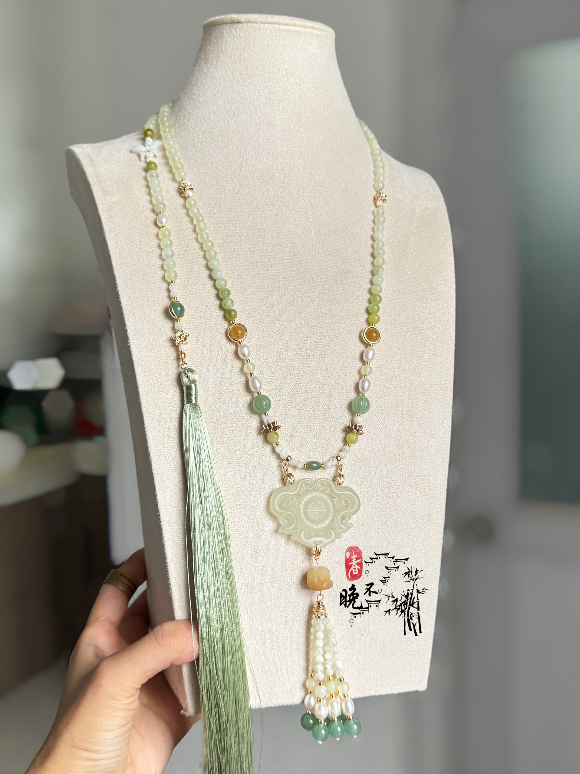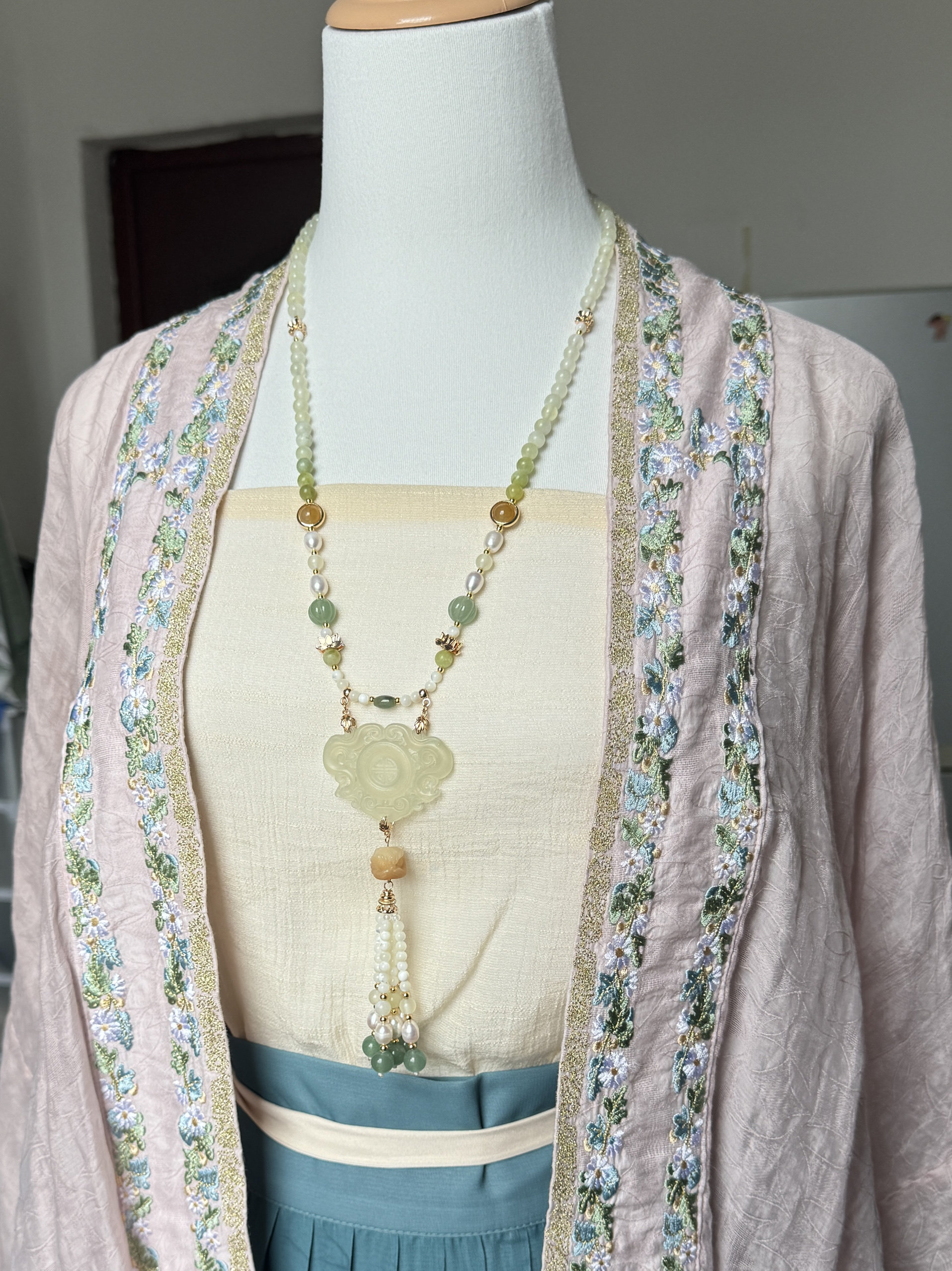 春不晚手作 原创淡水珍珠岫玉璎珞背云汉服旗袍配饰项链