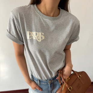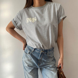 夏季 纯棉t恤女短袖 上衣灰色条纹字母正肩圆领上衣 韩系甜美 ACRAB
