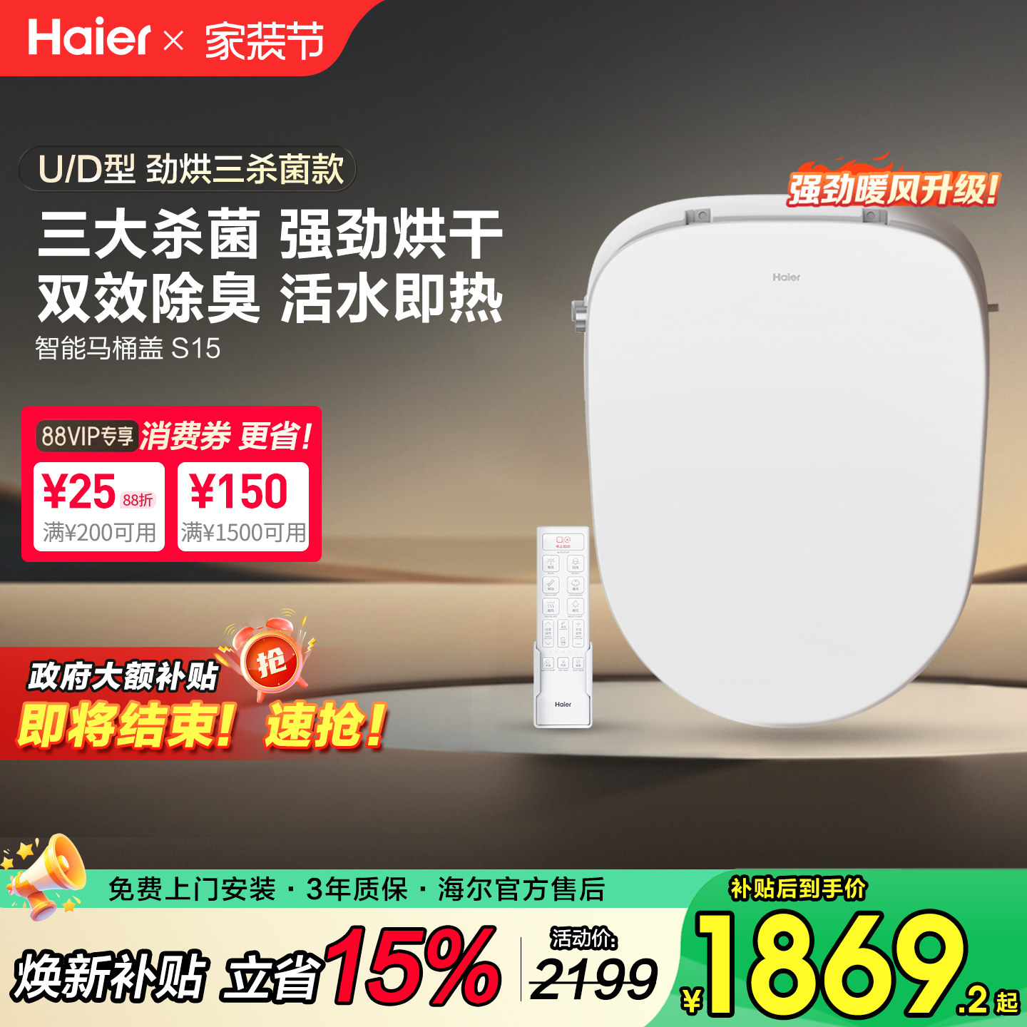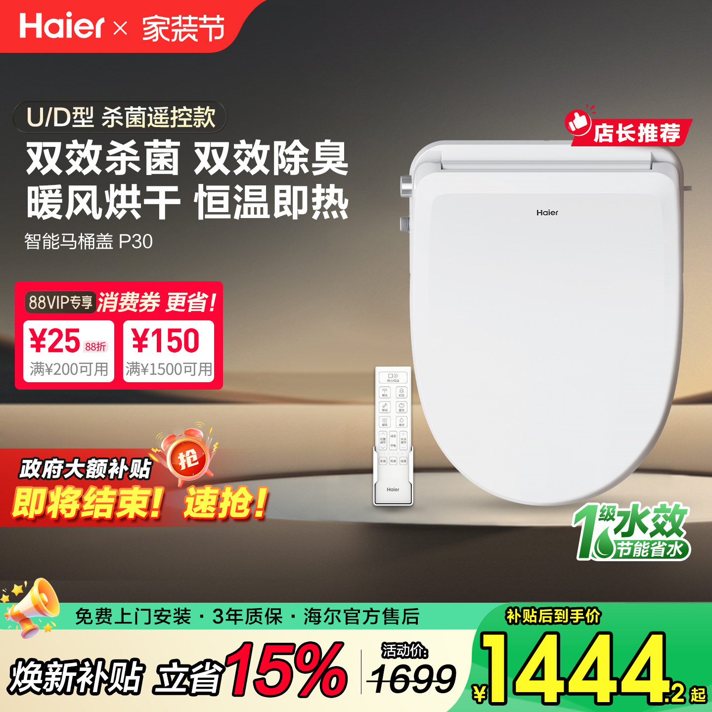 D型专用电动即热洗烘干坐便圈 海尔智能马桶盖板U 政府补贴15%